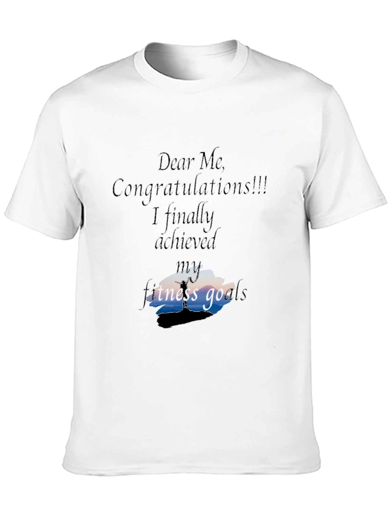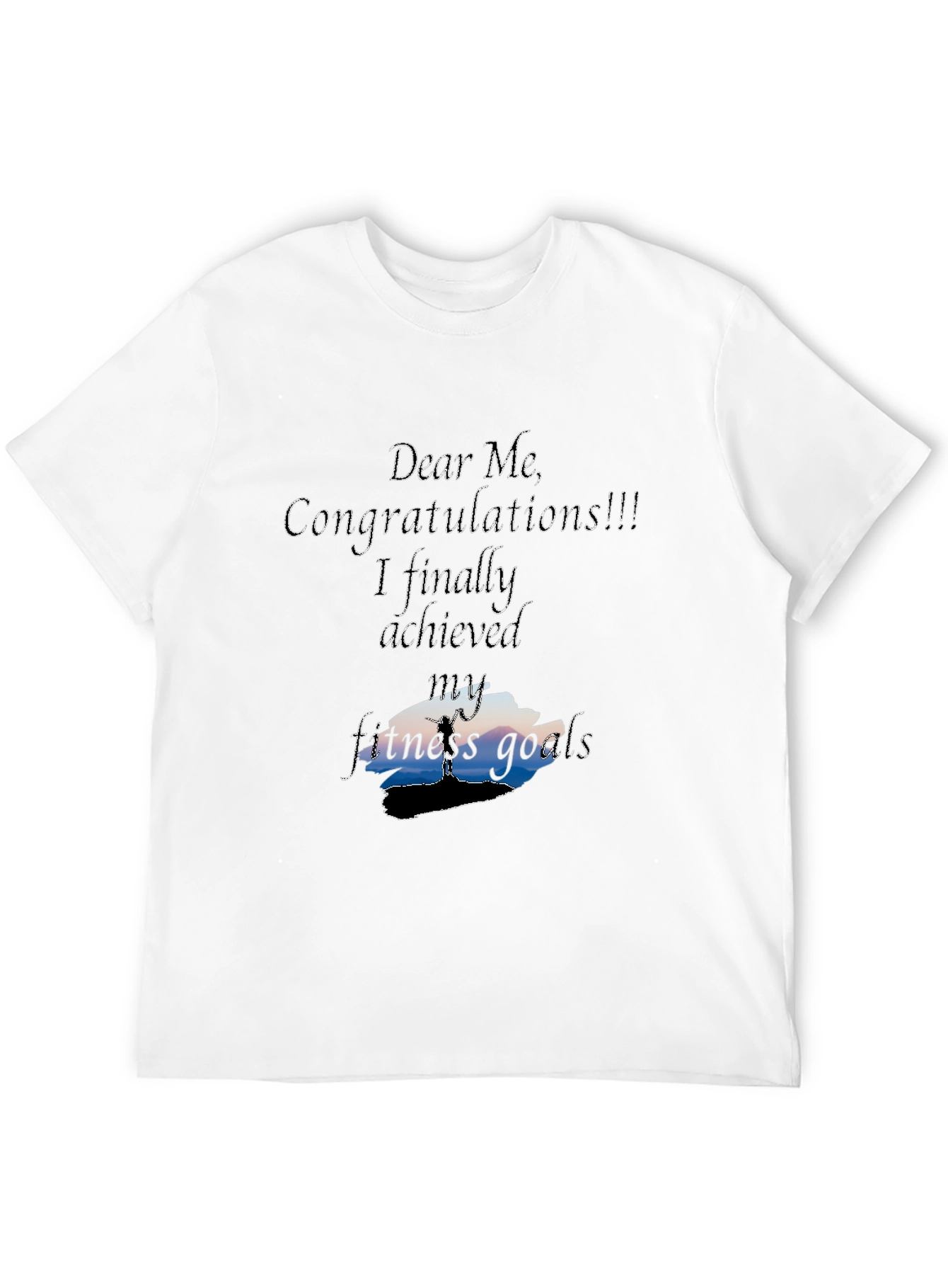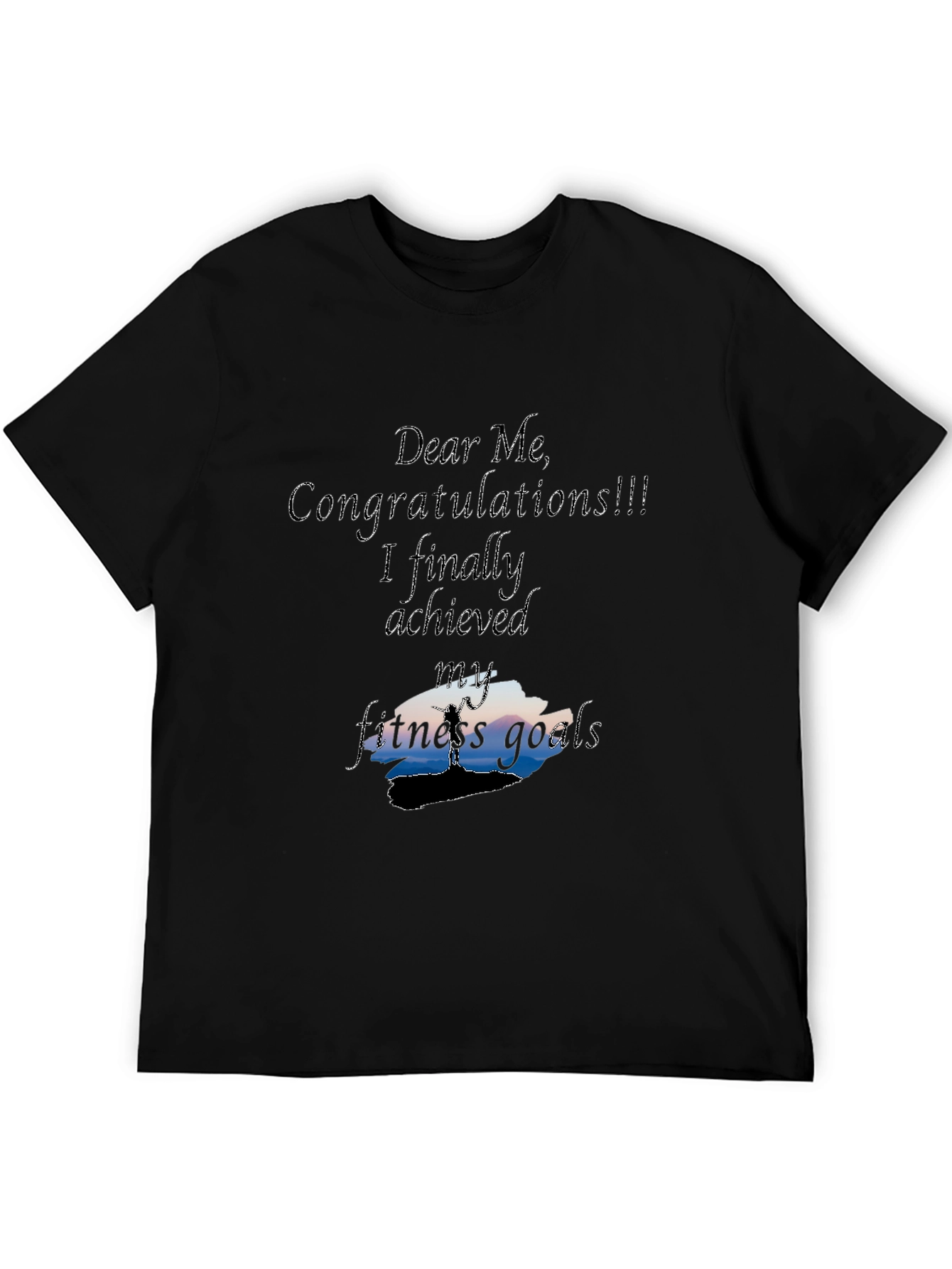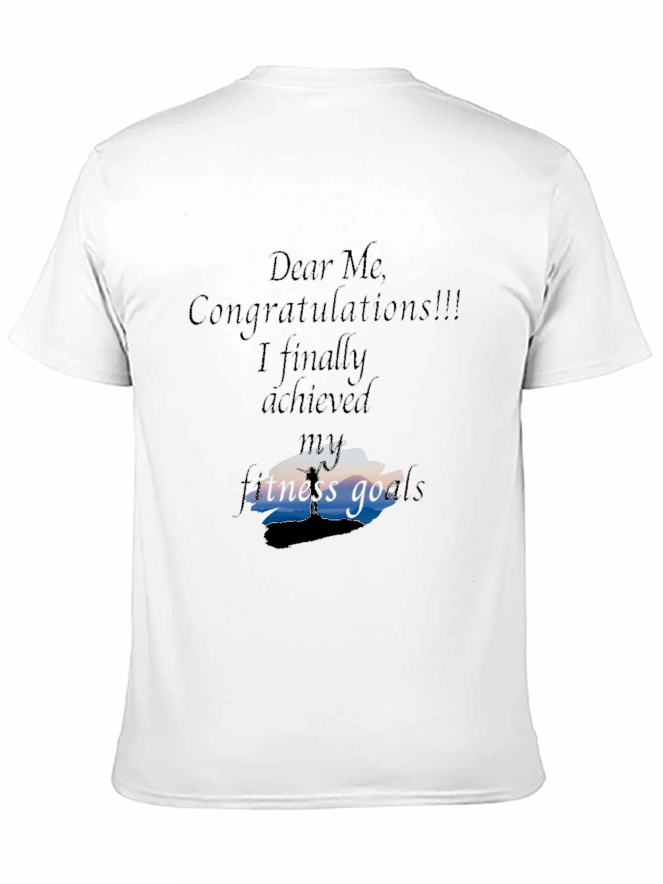 Celebra tus logros con esta camiseta negra de diseño único. La camiseta presenta una inscripción motivadora que dice 'Querido yo, ¡felicidades! Finalmente logré mis objetivos de fitness'. La ilustración muestra una silueta de una persona entrenando, resaltando la importancia de la salud y el bienestar. Ideal para usar en el gimnasio, durante tus entrenamientos o simplemente para inspirarte en tu día a día. Fabricada con materiales cómodos y duraderos, esta camiseta te mantendrá fresco mientras persigues tus sueños. ¡Demuestra tu dedicación al fitness con estilo!