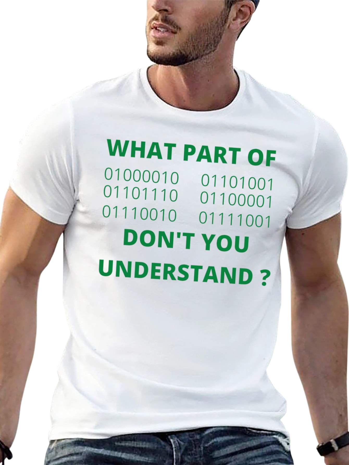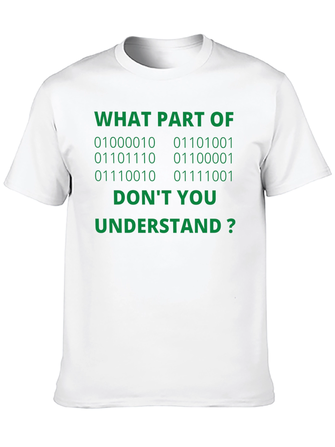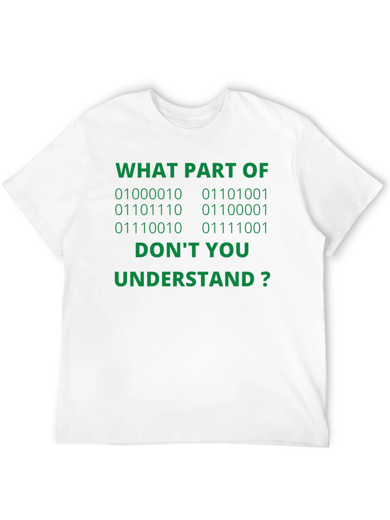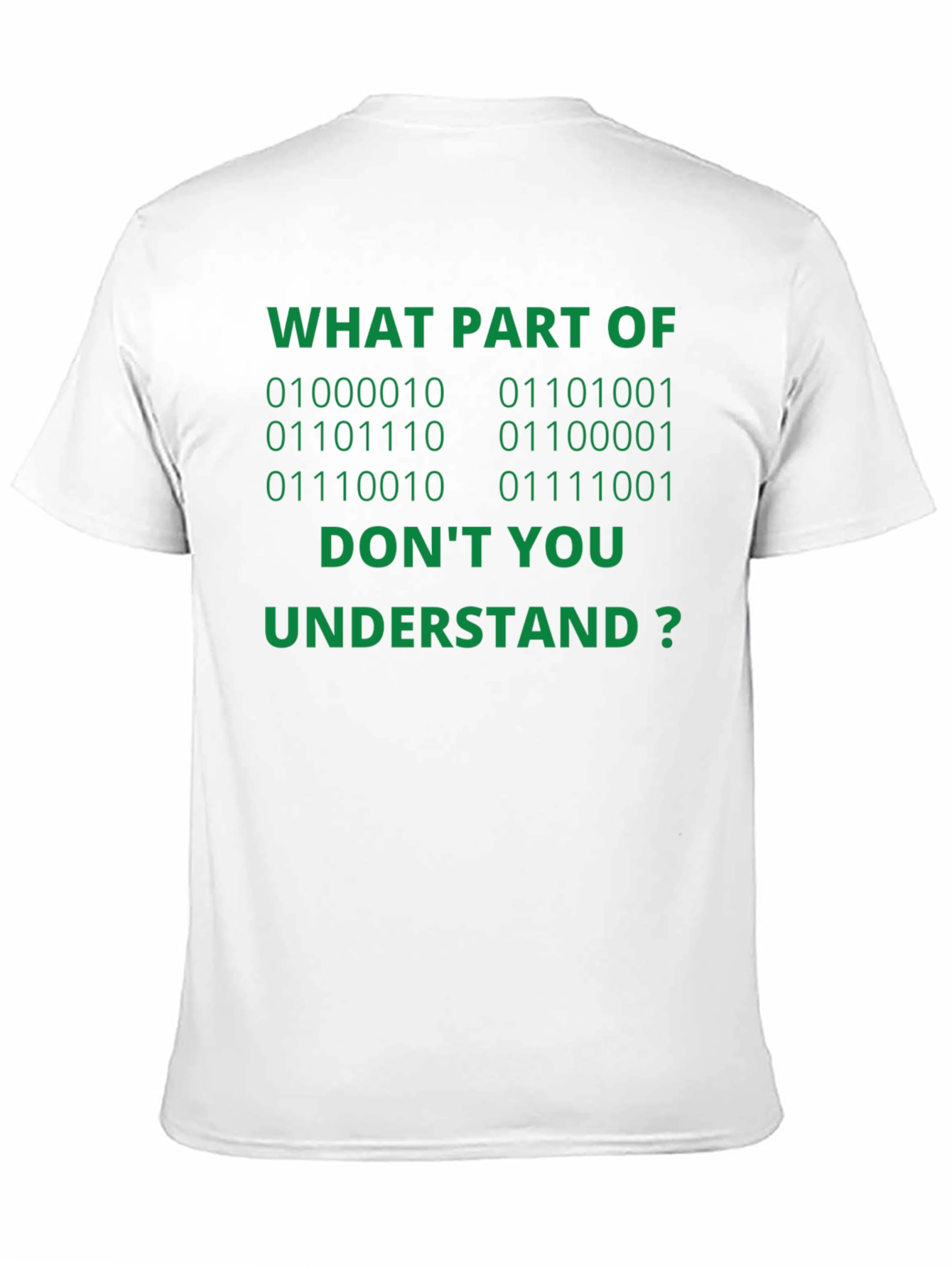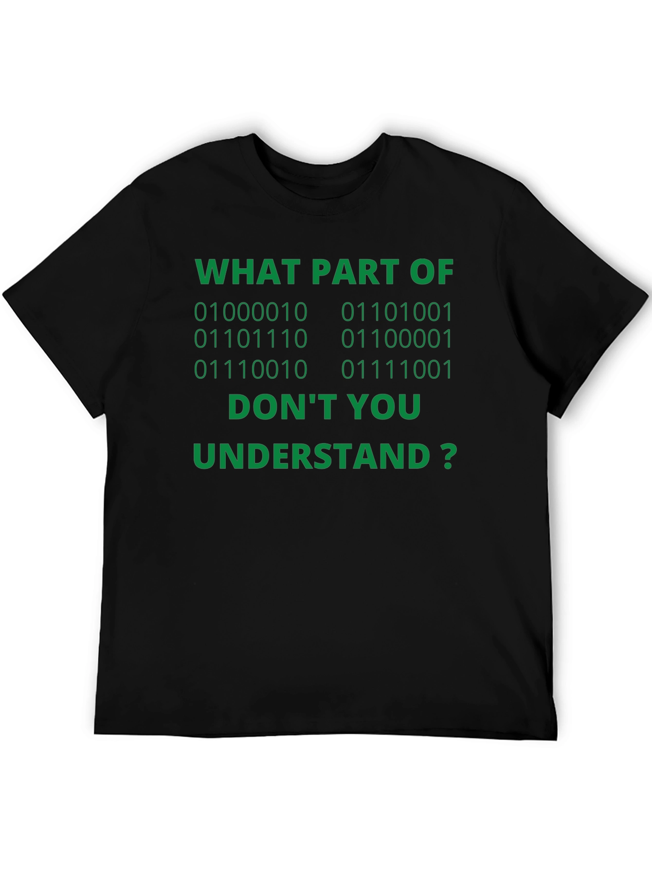 Esta camiseta negra de manga corta presenta una divertida inscripción en verde que atraerá todas las miradas. El texto, "WHAT PART OF [Código Binario] DON'T YOU UNDERSTAND?" (¿QUÉ PARTE DE [Código Binario] NO ENTIENDES?), es perfecto para los amantes de la informática y la programación con sentido del humor. Confeccionada con materiales suaves y cómodos, esta camiseta es ideal para el día a día, ya sea para llevarla a clase, al trabajo o simplemente para relajarte en casa. Demuestra tu pasión por la tecnología con esta prenda original y llamativa. ¡Un regalo perfecto para geeks y nerds con estilo!