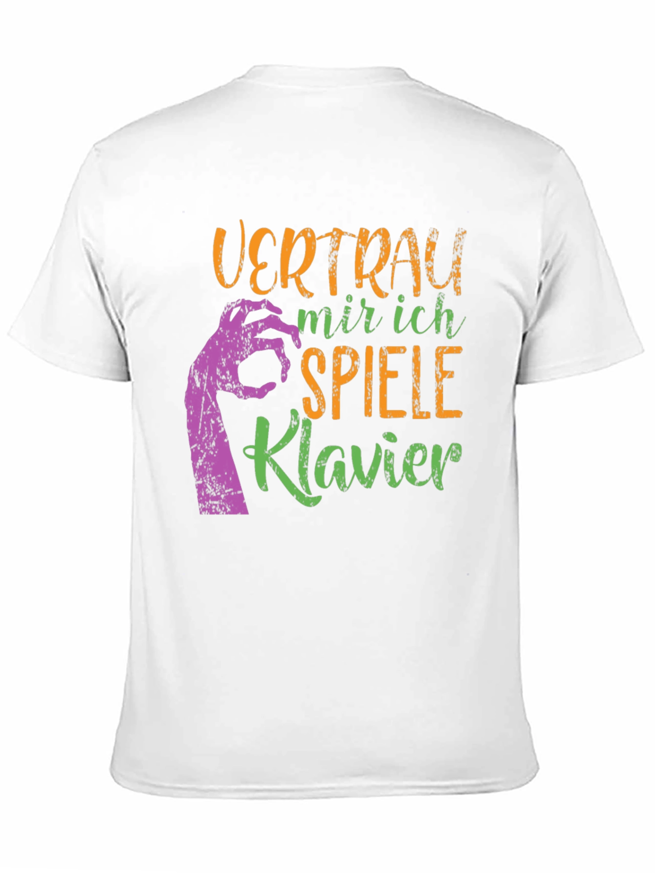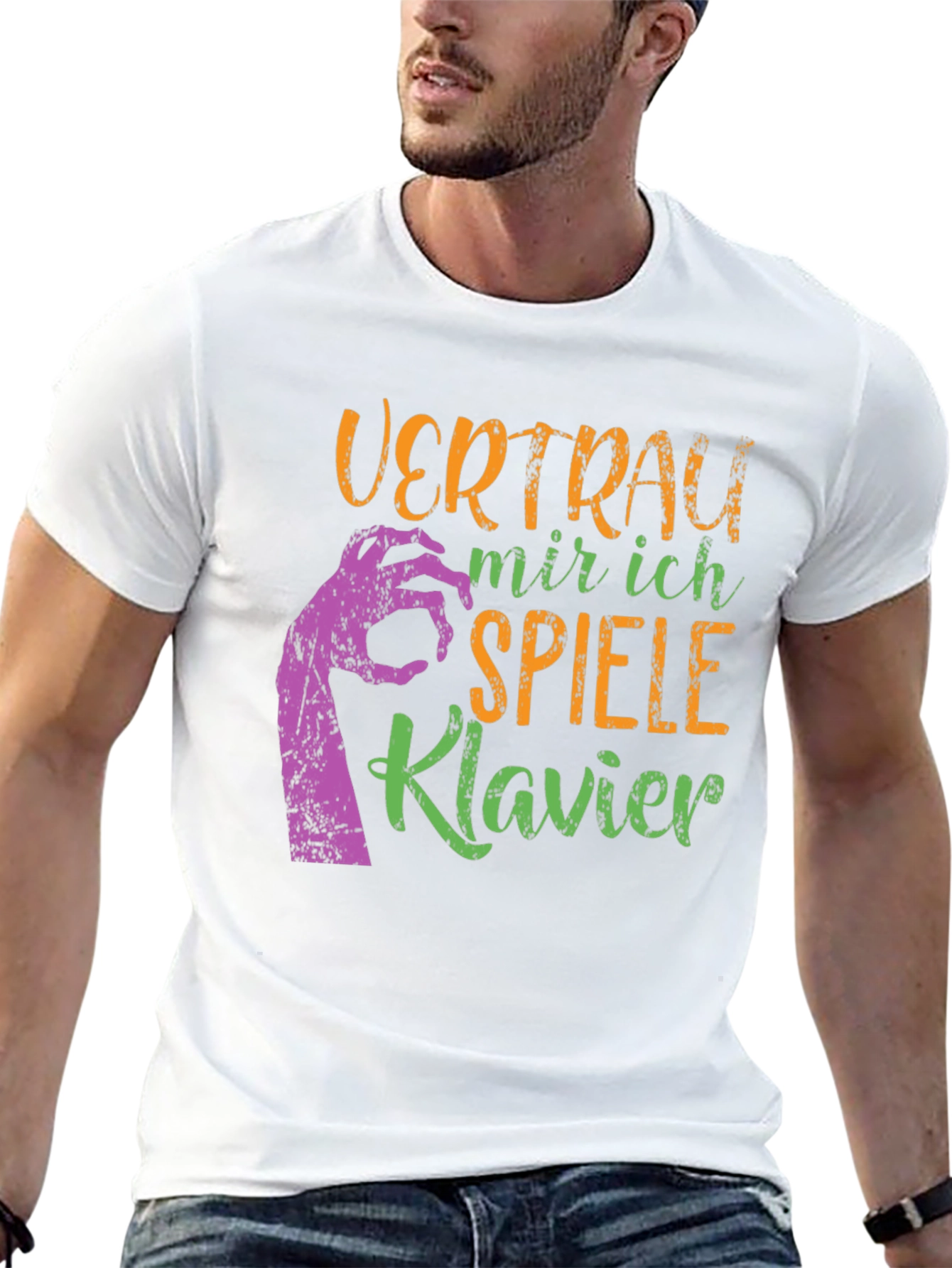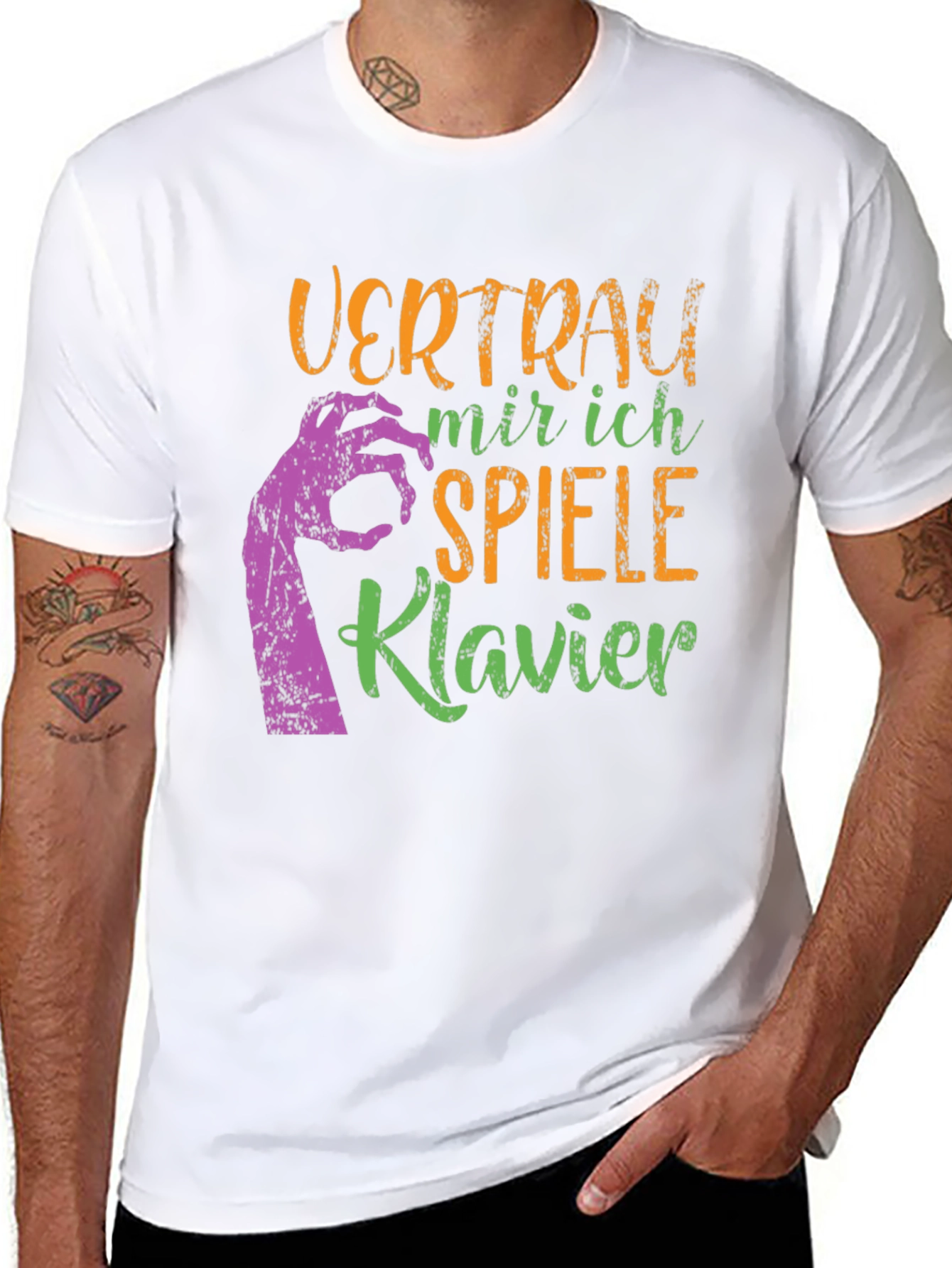 Luce esta original camiseta negra con un diseño llamativo. La frase "Vertrau mir ich spiele Klavier" (Confía en mí, toco el piano) está impresa en colores naranja y verde vibrantes, acompañada de una mano morada de estilo grunge que le da un toque distintivo. Fabricada en un tejido suave y cómodo, esta camiseta de manga corta es perfecta para un look casual y moderno. Ideal para amantes de la música, pianistas y cualquiera que quiera expresar su personalidad con estilo. Úsala en conciertos, reuniones informales o simplemente para destacar en tu día a día. ¡Una prenda única que no pasará desapercibida!