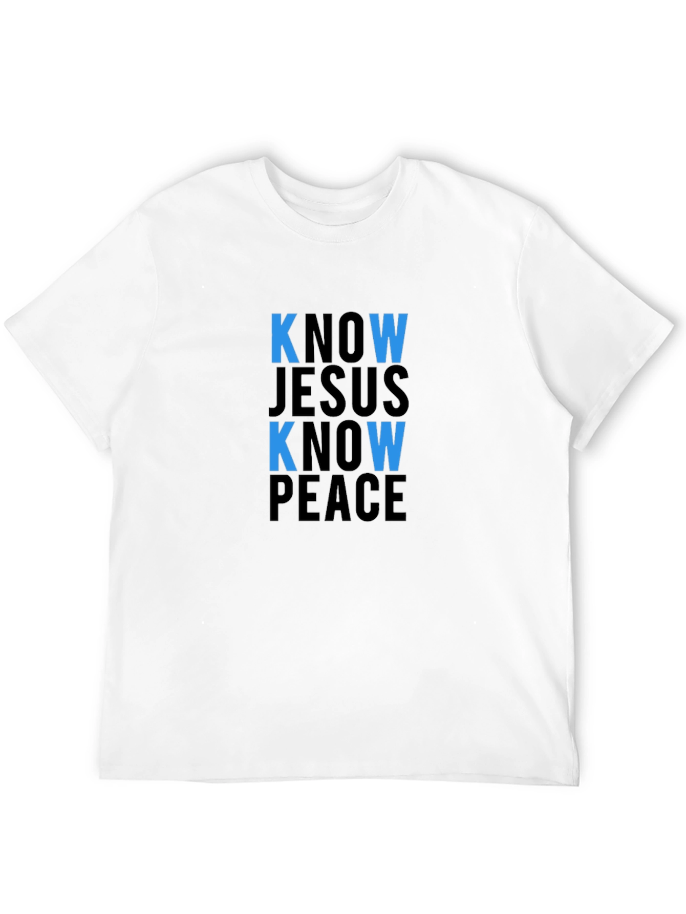 Luce esta elegante camiseta negra con un mensaje inspirador. Presenta una tipografía llamativa en dos tonos de azul y negro que dice "KNOW JESUS KNOW PEACE" (Conoce a Jesús, Conoce la Paz). Perfecta para expresar tu fe con estilo. Su diseño clásico de manga corta y corte regular la hacen ideal para el uso diario, ya sea para un evento casual o una reunión especial. Fabricada en un tejido suave y cómodo, esta camiseta te proporcionará confort durante todo el día. Combínala con tus jeans favoritos para un look relajado o con pantalones de vestir para una ocasión más formal. Un regalo significativo para amigos y familiares.