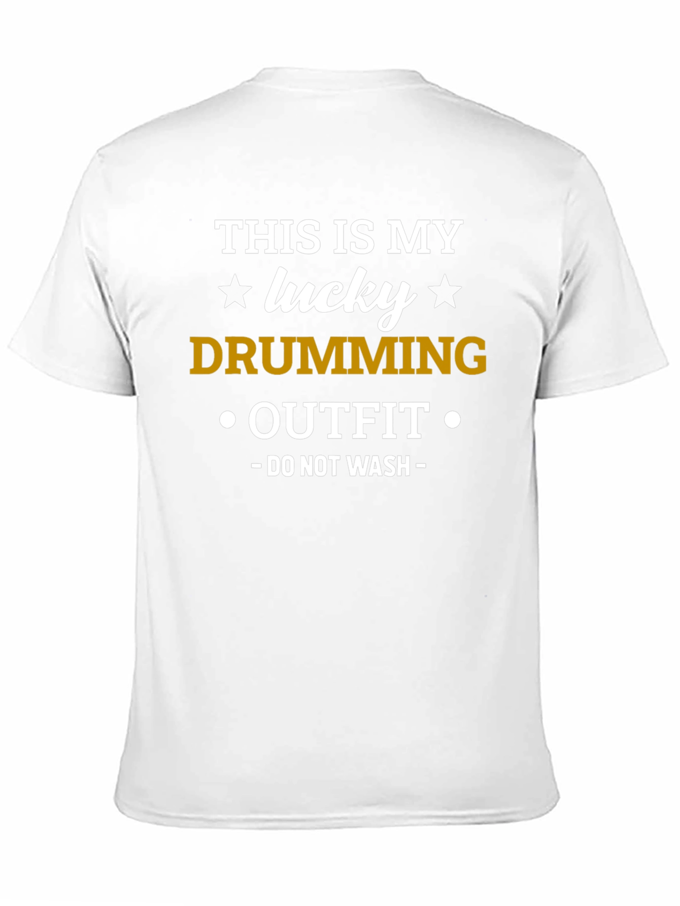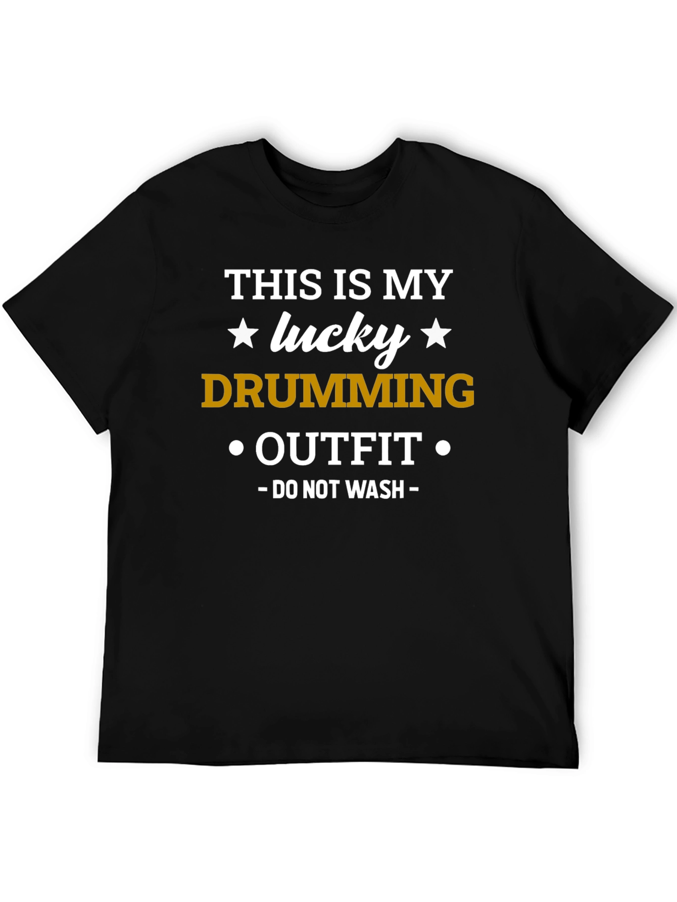 Esta camiseta negra presenta un diseño divertido y llamativo. En la parte delantera, se lee el texto "THIS IS MY ★ lucky ★ DRUMMING • OUTFIT • - DO NOT WASH-". La palabra "lucky" está resaltada con estrellas. La frase "DRUMMING OUTFIT" aparece en color dorado. Esta camiseta es ideal para bateristas que buscan expresar su pasión por la música con un toque de humor y originalidad. Perfecta para conciertos, ensayos o simplemente para el día a día, esta prenda seguramente llamará la atención y mostrará tu estilo único. ¡Luce tu amor por la batería con esta camiseta divertida y cómoda!