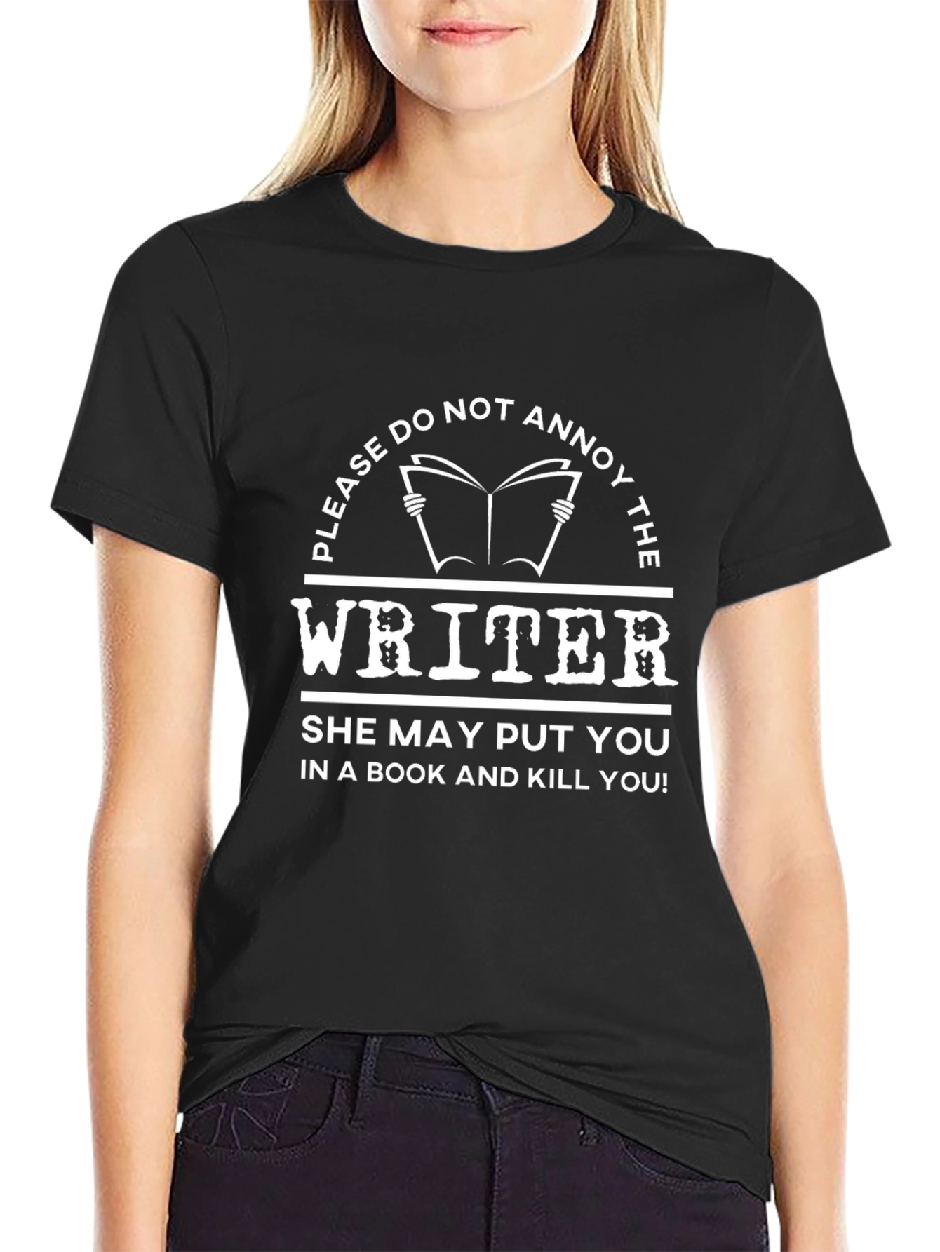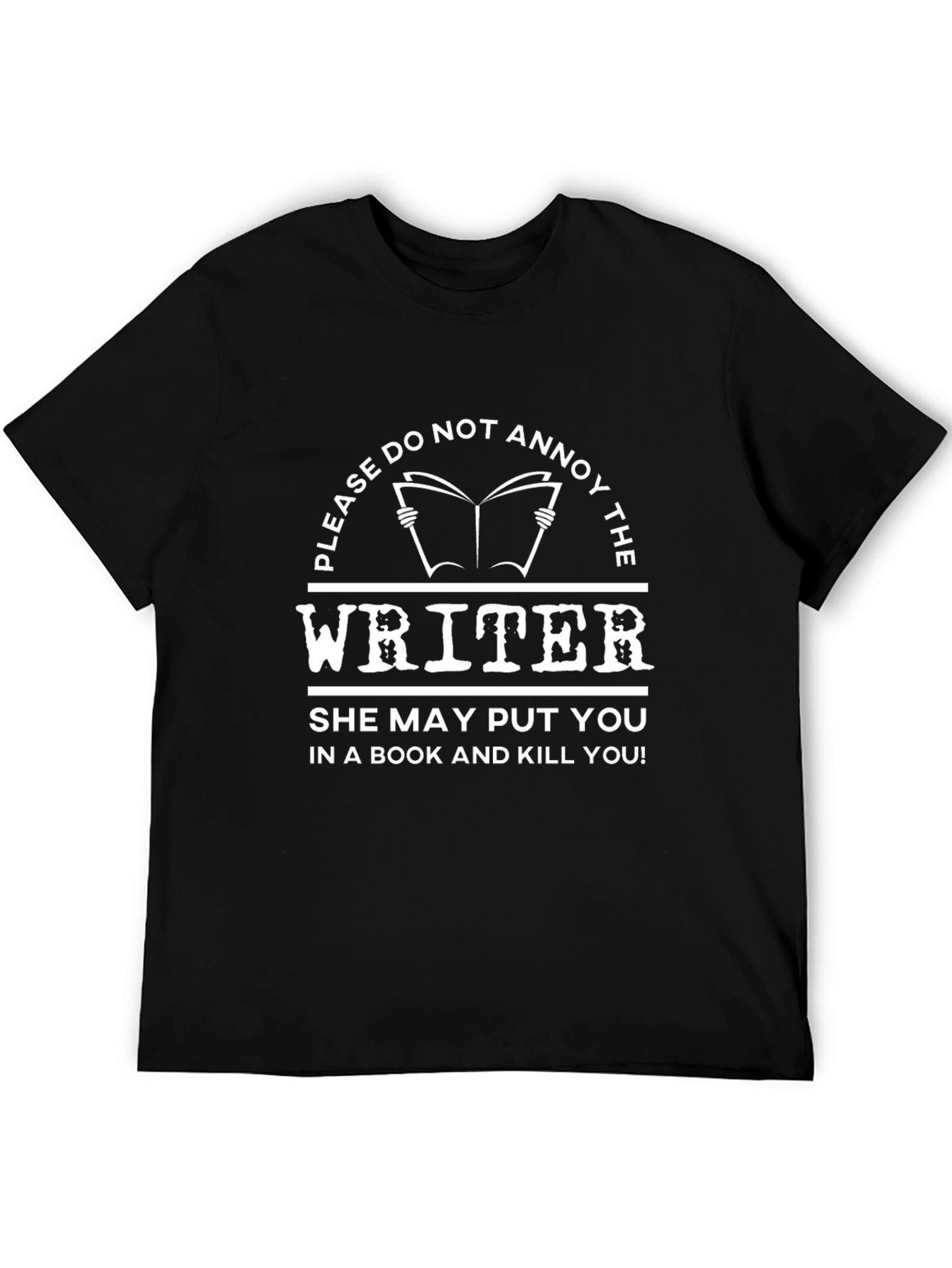 Esta camiseta negra presenta un diseño llamativo en color blanco. El texto dice: "PLEASE DO NOT ANNOY THE WRITER. SHE MAY PUT YOU IN A BOOK AND KILL YOU!" (Por favor, no molestes al escritor. ¡Ella puede ponerte en un libro y matarte!). La frase está adornada con un dibujo de un libro abierto y elementos decorativos que le dan un toque divertido y amenazante. Perfecta para escritores con sentido del humor o para aquellos que prefieren que los dejen trabajar en paz. Ideal para usar en casa, bibliotecas o eventos literarios. Hazte con esta camiseta única y muestra tu lado creativo.