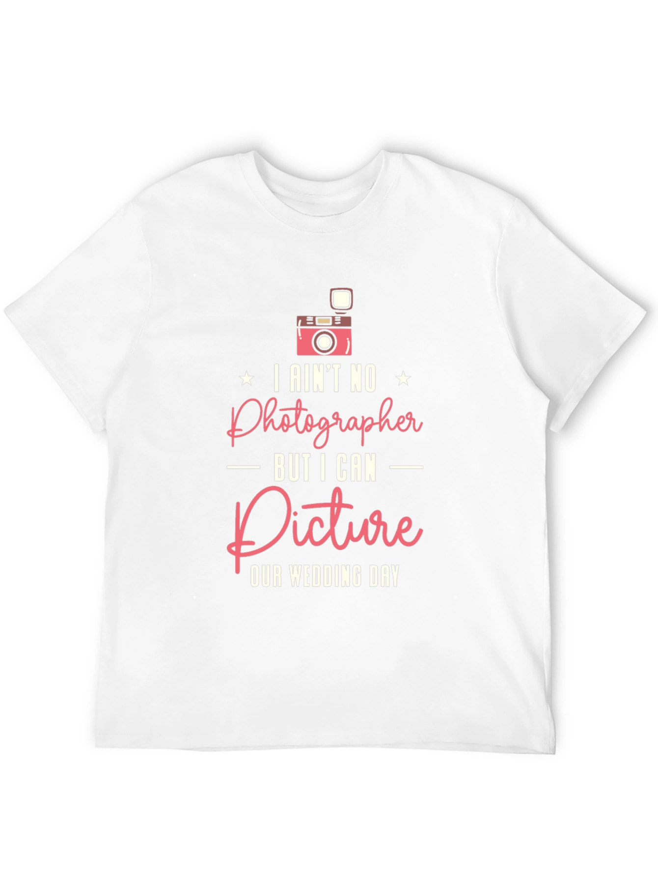Esta camiseta negra presenta un diseño divertido e ingenioso. Con una ilustración de una cámara retro en color rosa, la frase "I AIN'T NO Photographer BUT I CAN Picture OUR WEDDING DAY" está impresa en una tipografía atractiva, combinando letras en color negro y rosa. Perfecta para cualquier ocasión informal, esta camiseta seguramente provocará sonrisas y conversaciones. Ideal para aquellos que aprecian el humor y la originalidad en su vestimenta. Confeccionada en un material suave y cómodo, esta camiseta es una excelente adición a cualquier guardarropa casual. ¡Muestra tu lado divertido con esta prenda única!