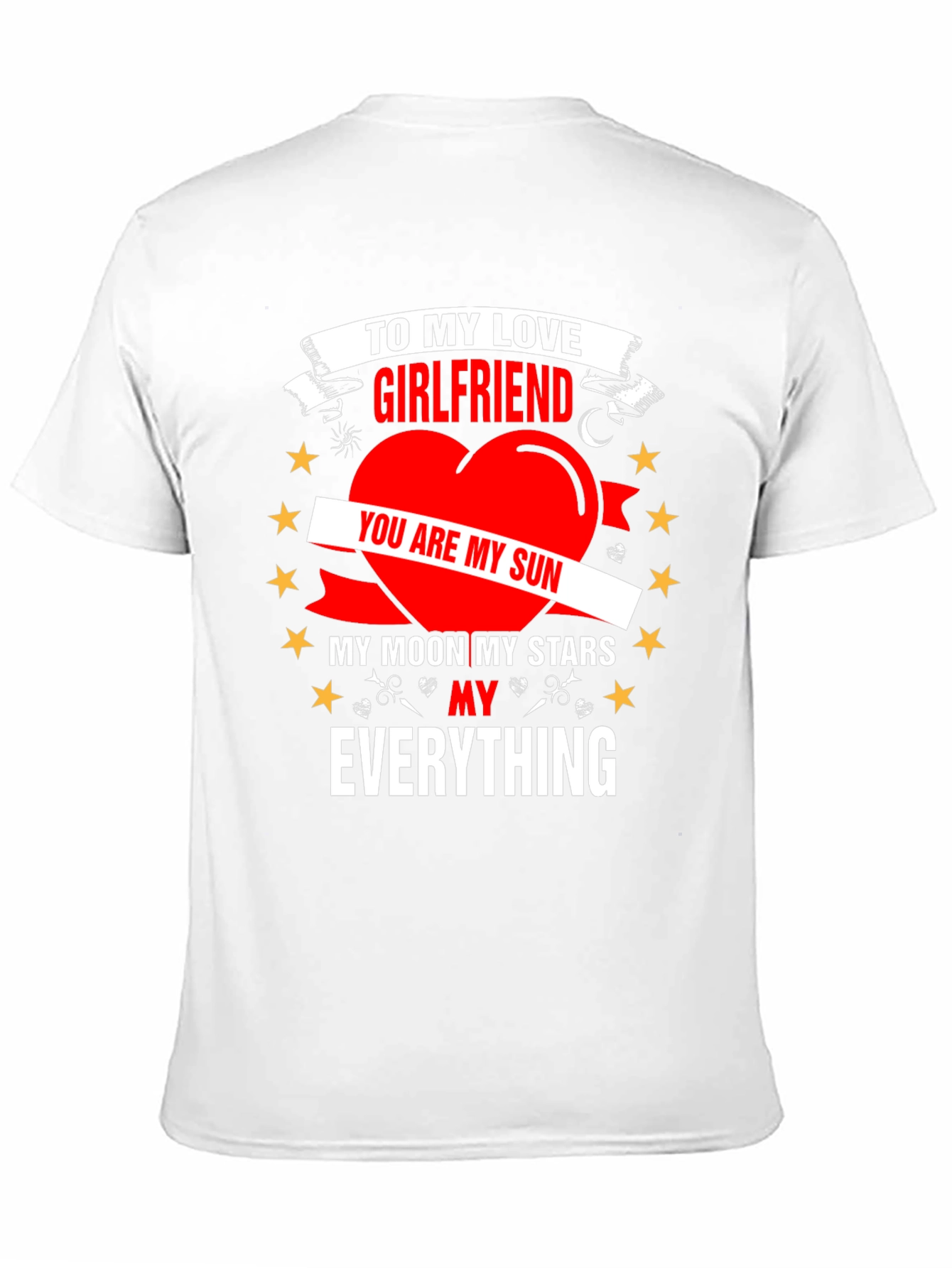Expresa tu amor con esta camiseta negra de manga corta. Un diseño llamativo con un corazón rojo y texto en blanco proclama tu afecto: "Para mi novia, eres mi sol, mi luna, mis estrellas, mi todo". Ideal para regalar a tu pareja en aniversarios, San Valentín o cualquier ocasión especial. Perfecta para usar a diario, esta camiseta añade un toque romántico a cualquier outfit. ¡Demuestra tu amor de una forma única y original! Material suave y cómodo para uso casual.