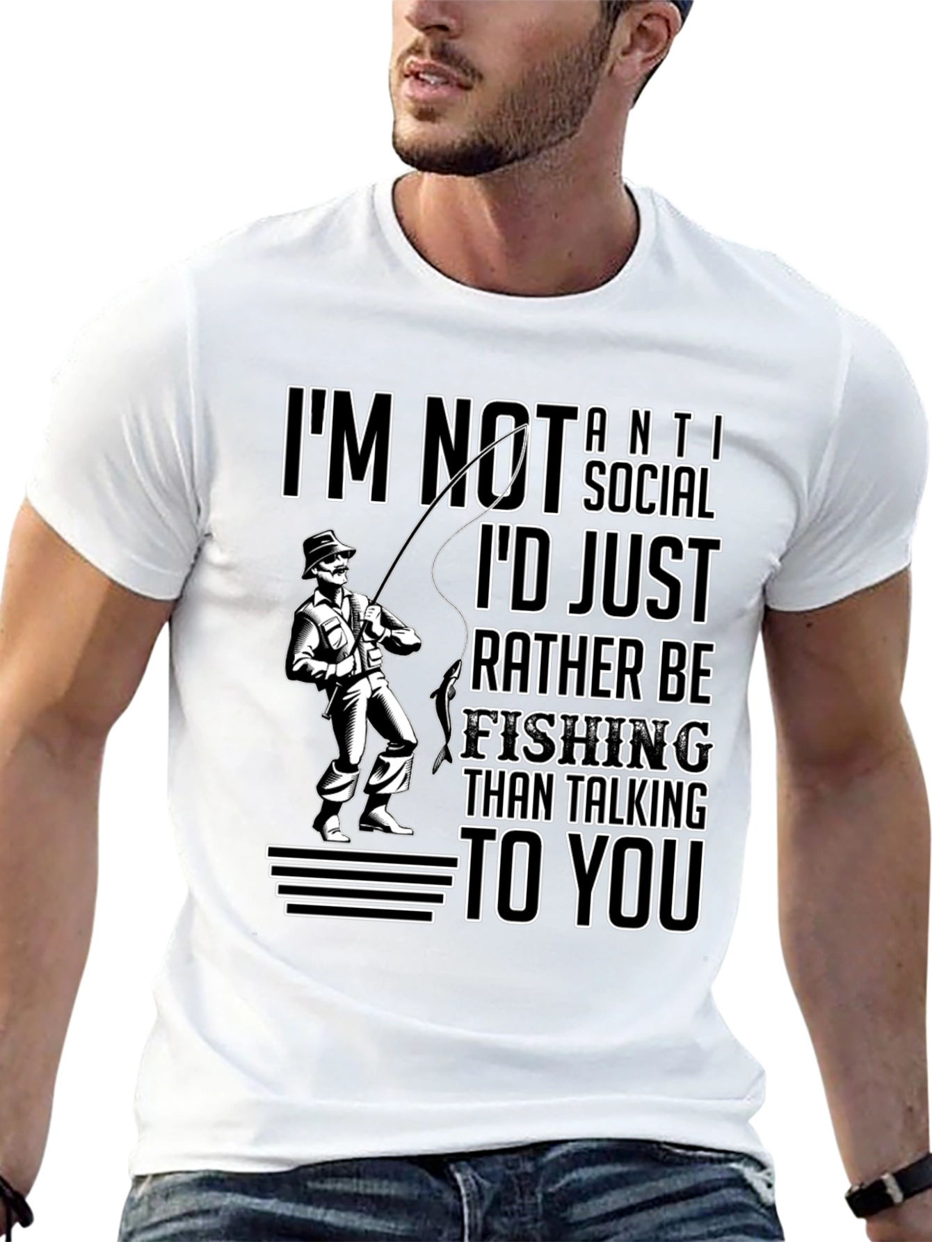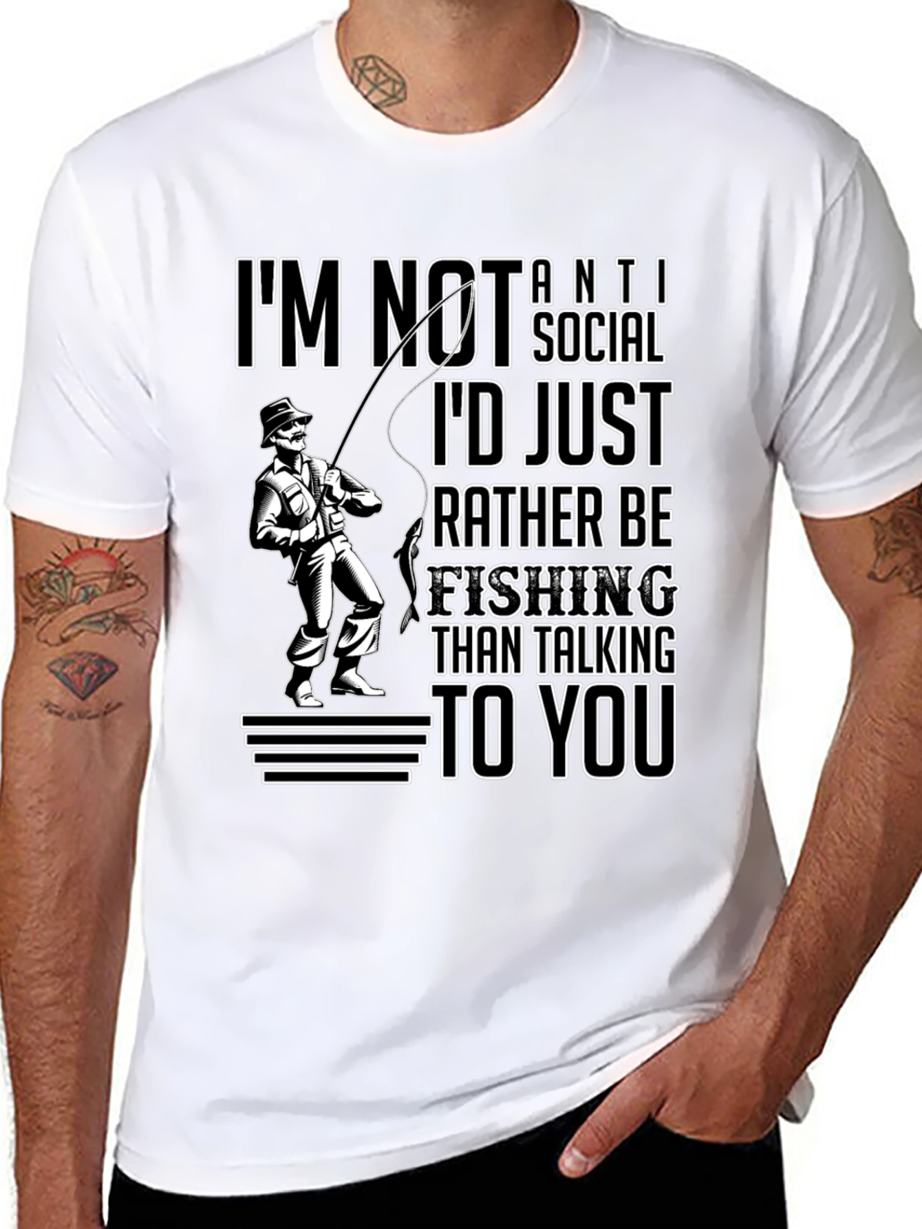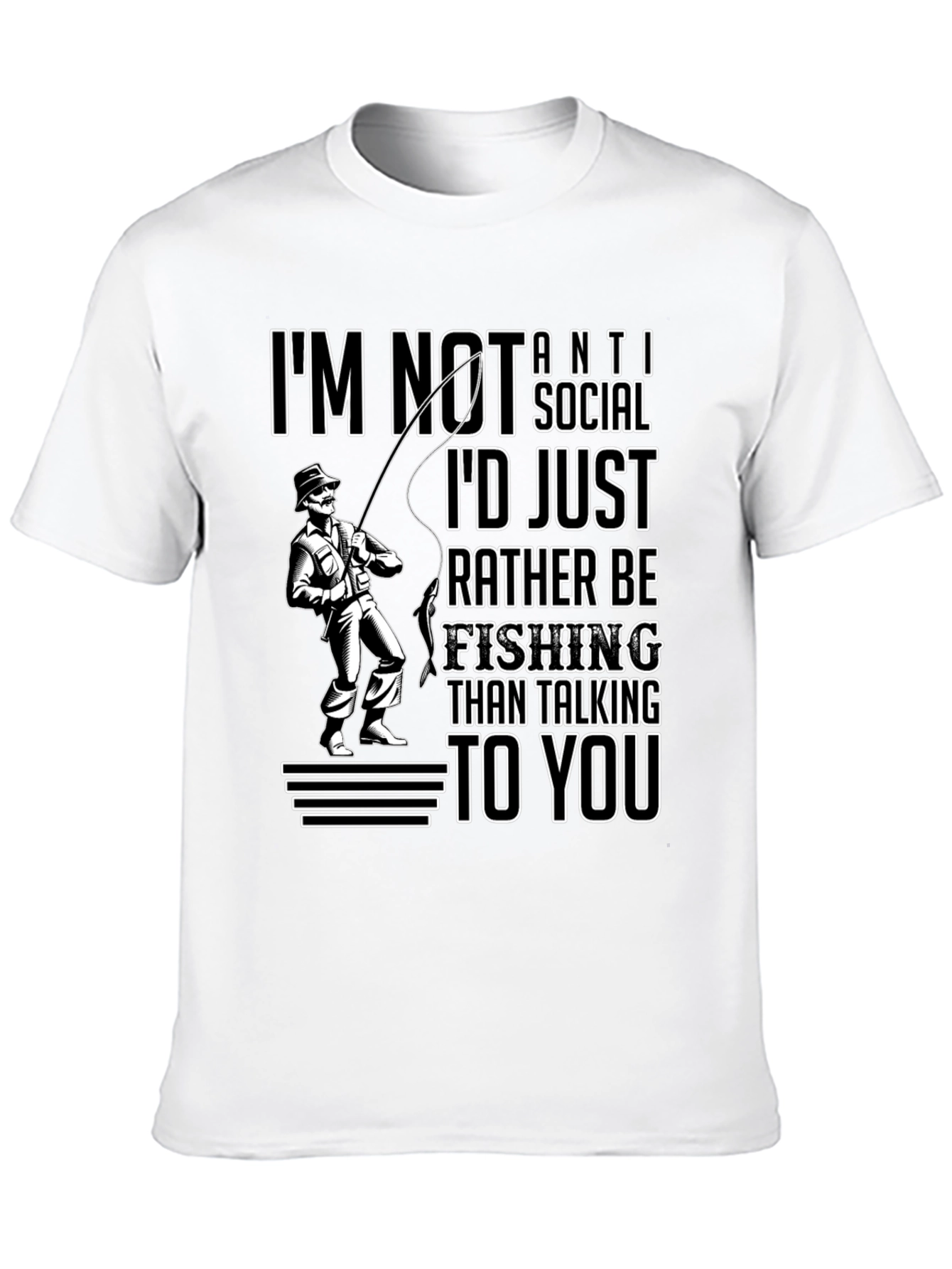 Esta camiseta negra de manga corta presenta un diseño llamativo para los amantes de la pesca. Muestra la frase "I'm not anti-social, I'd just rather be fishing than talking to you" (No soy antisocial, prefiero pescar a hablar contigo) junto a la ilustración de un pescador. El diseño está impreso en blanco y ofrece un contraste nítido con el fondo negro, lo que lo hace destacar. Ideal para usar en salidas de pesca, actividades al aire libre o simplemente para expresar tu pasión por este deporte. Esta camiseta combina comodidad y estilo, perfecta para relajarte mientras esperas la picada.