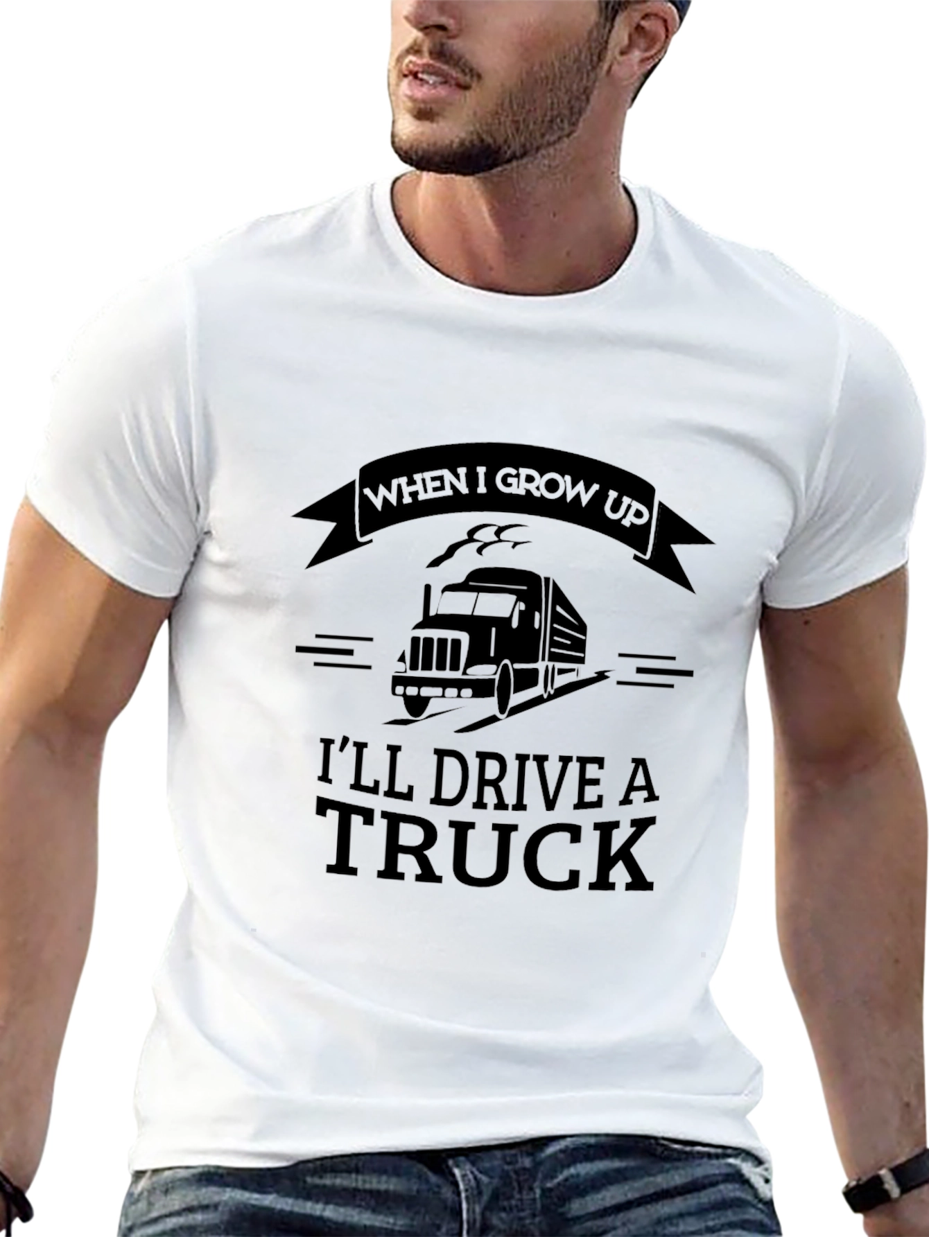 Esta camiseta negra presenta un diseño llamativo para los amantes de los camiones. Muestra la frase "When I grow up, I'll drive a truck" (Cuando crezca, conduciré un camión) junto con la ilustración de un camión grande, evocando aspiraciones de infancia y pasión por la carretera. Fabricada con tela suave y cómoda, esta camiseta de manga corta es ideal para el uso diario. Su corte clásico asegura un ajuste relajado, perfecto para cualquier ocasión casual. Muestra tu sueño de ser camionero con esta prenda única y original, ideal para regalar a futuros conductores.