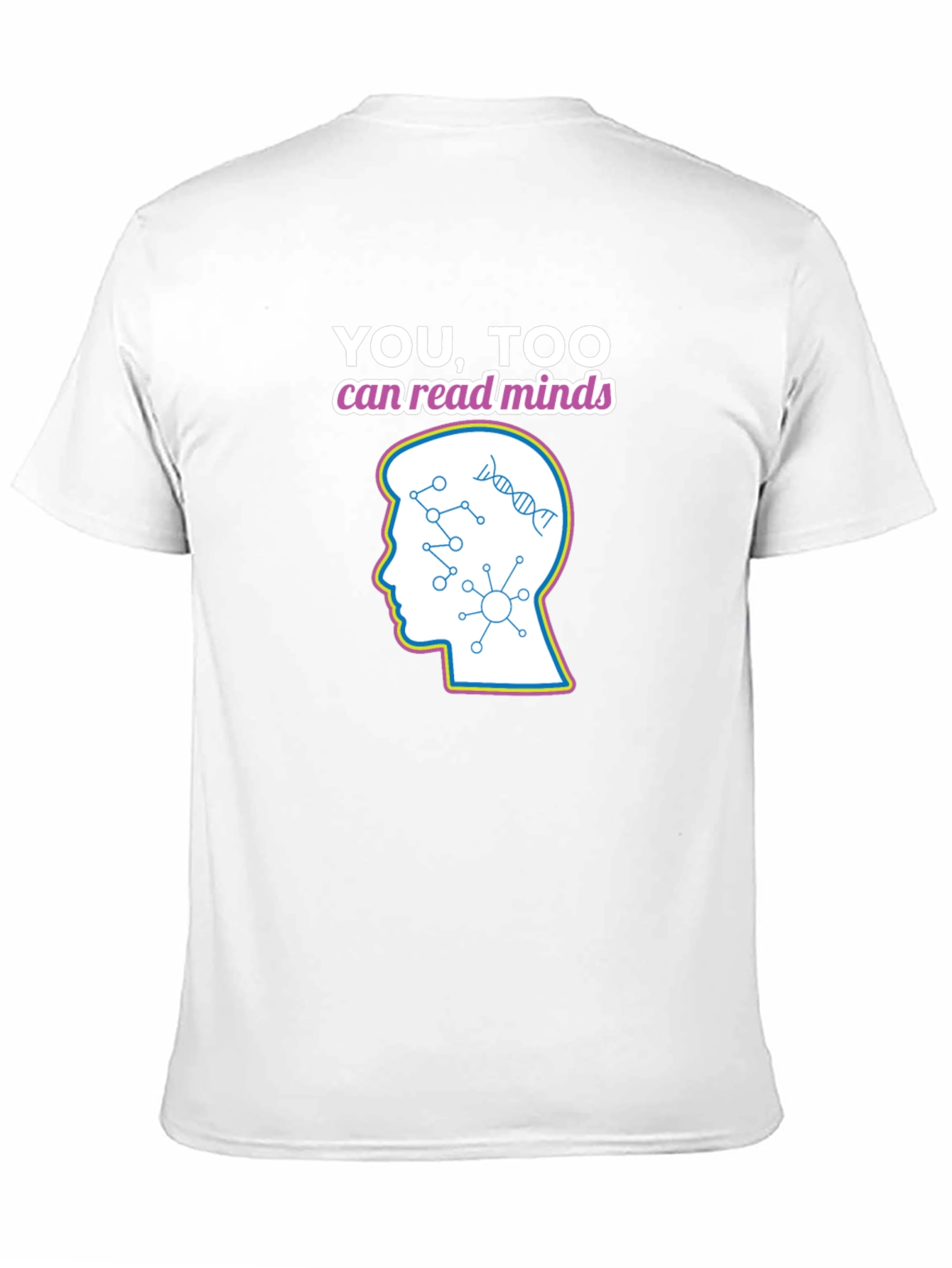 Descubre esta camiseta negra de manga corta con un diseño único. Presenta una ilustración de una cabeza humana con patrones que simulan conexiones neuronales y ADN, acompañada del texto "YOU, TOO can read minds". Ideal para aquellos que buscan expresar su curiosidad intelectual y sentido del humor. Perfecta para un look casual, ya sea para uso diario o para destacar en reuniones informales con amigos. Fabricada con materiales suaves y cómodos para asegurar una sensación agradable al tacto. Agrega un toque original y divertido a tu guardarropa con esta camiseta única.