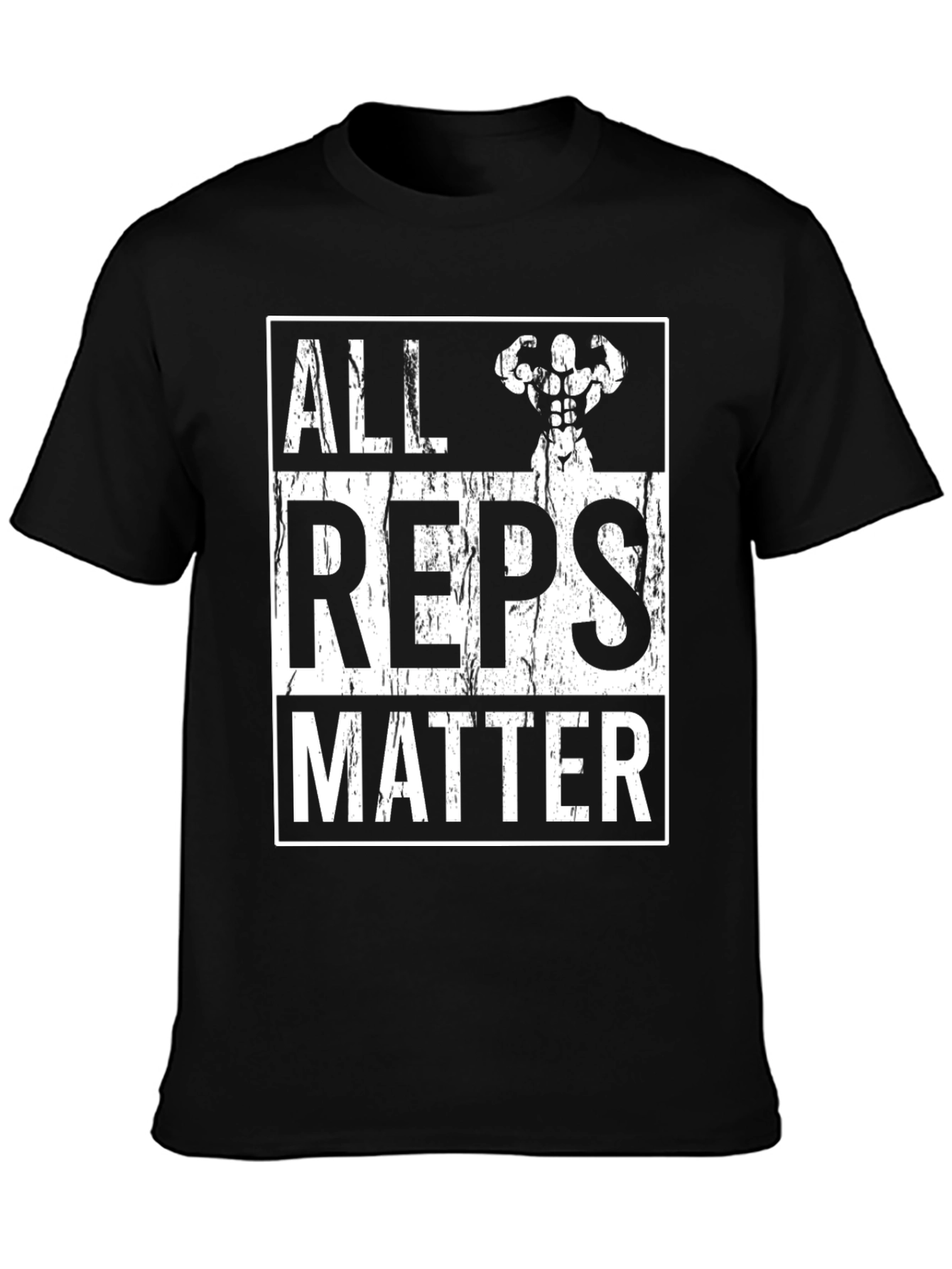 Muestra tu pasión por el fitness con esta camiseta negra de manga corta. El diseño presenta un estampado llamativo con el texto "ALL REPS MATTER" en letras blancas de estilo desgastado, enmarcado en un rectángulo blanco que resalta sobre el fondo negro. Un gráfico de una figura musculosa sustituye una letra, añadiendo un toque divertido y motivacional. Perfecta para entrenar en el gimnasio o para un look casual con un mensaje potente. Su tejido suave y cómodo te permitirá moverte con libertad. ¡Una declaración de intenciones para los amantes del fitness!