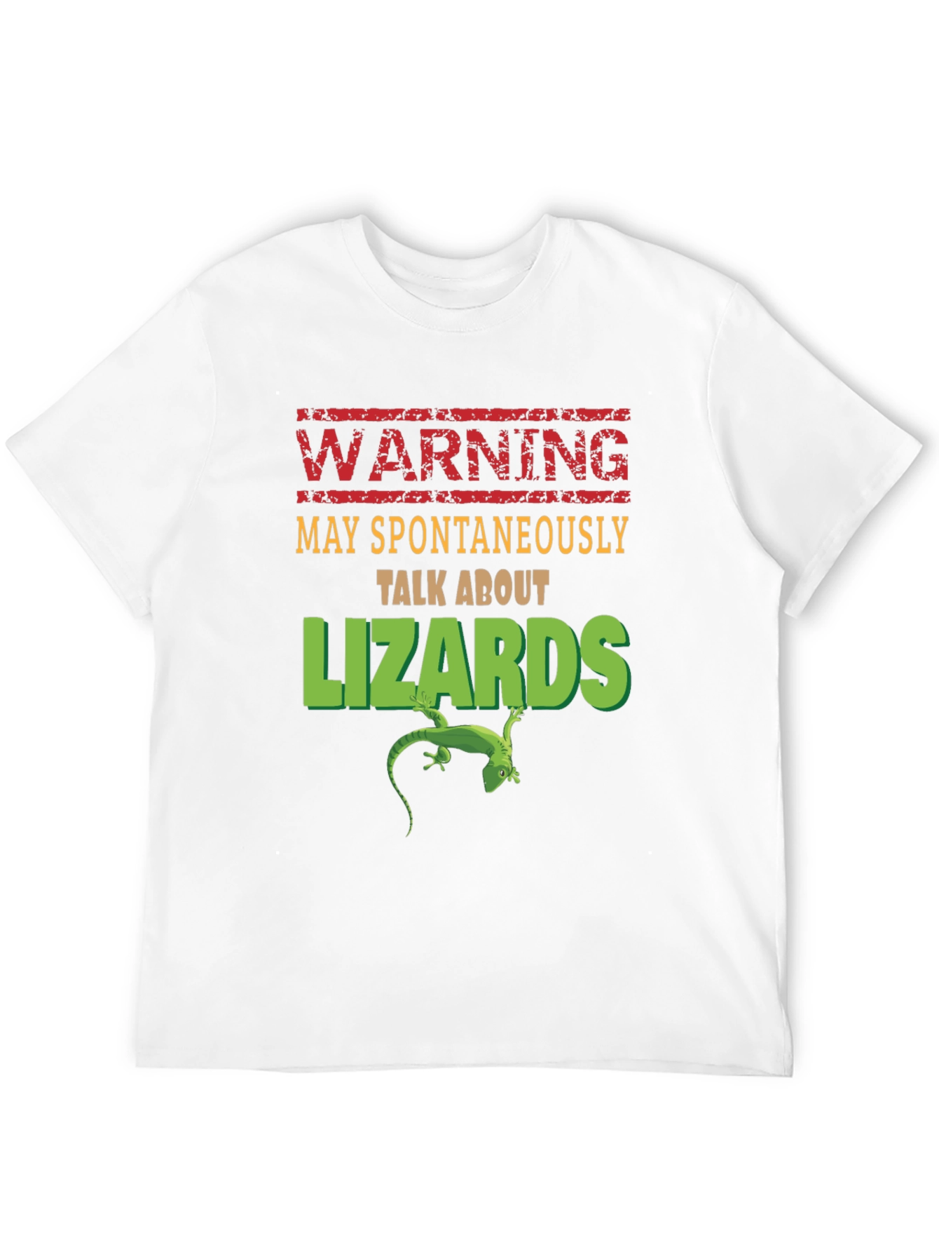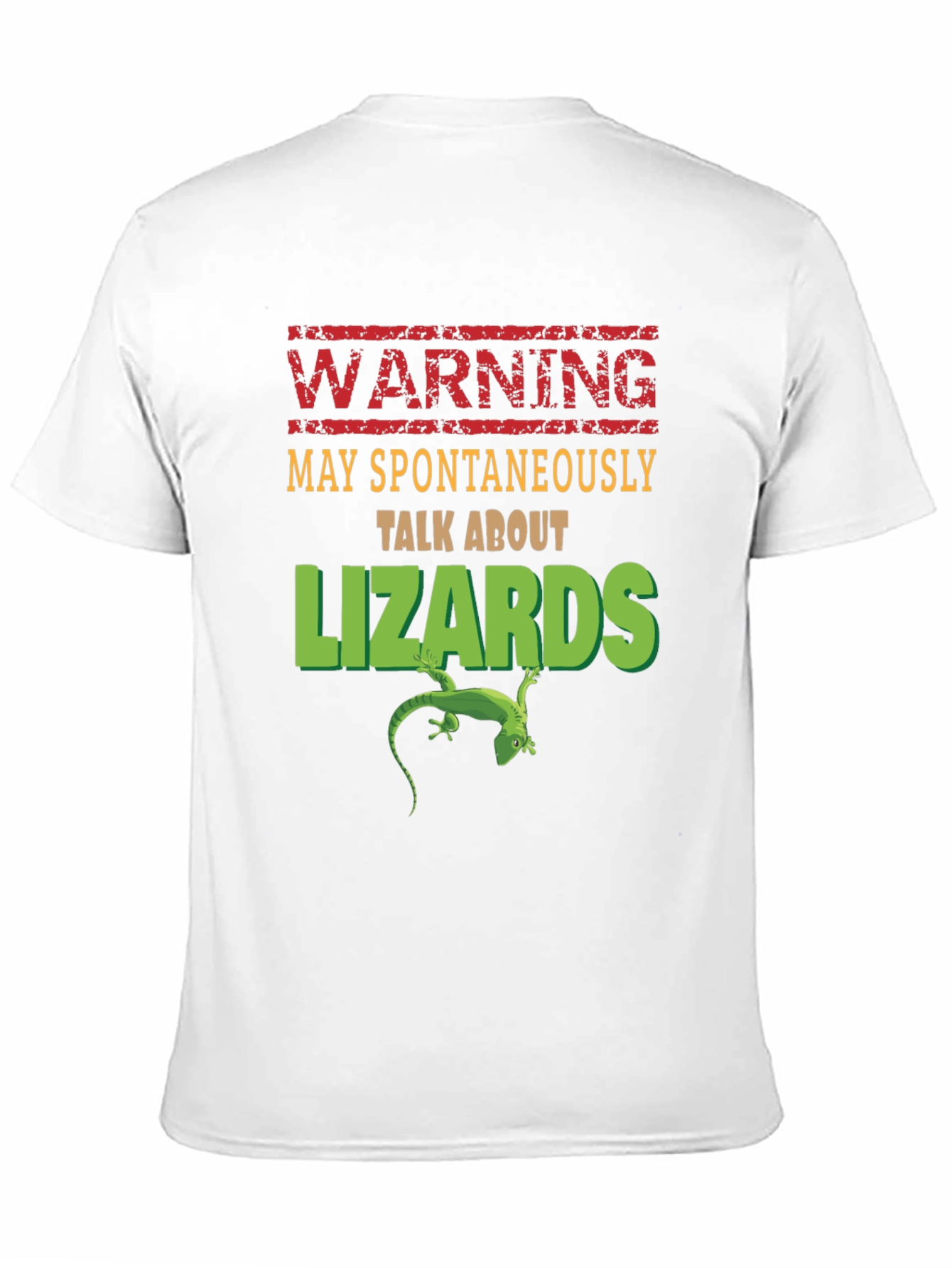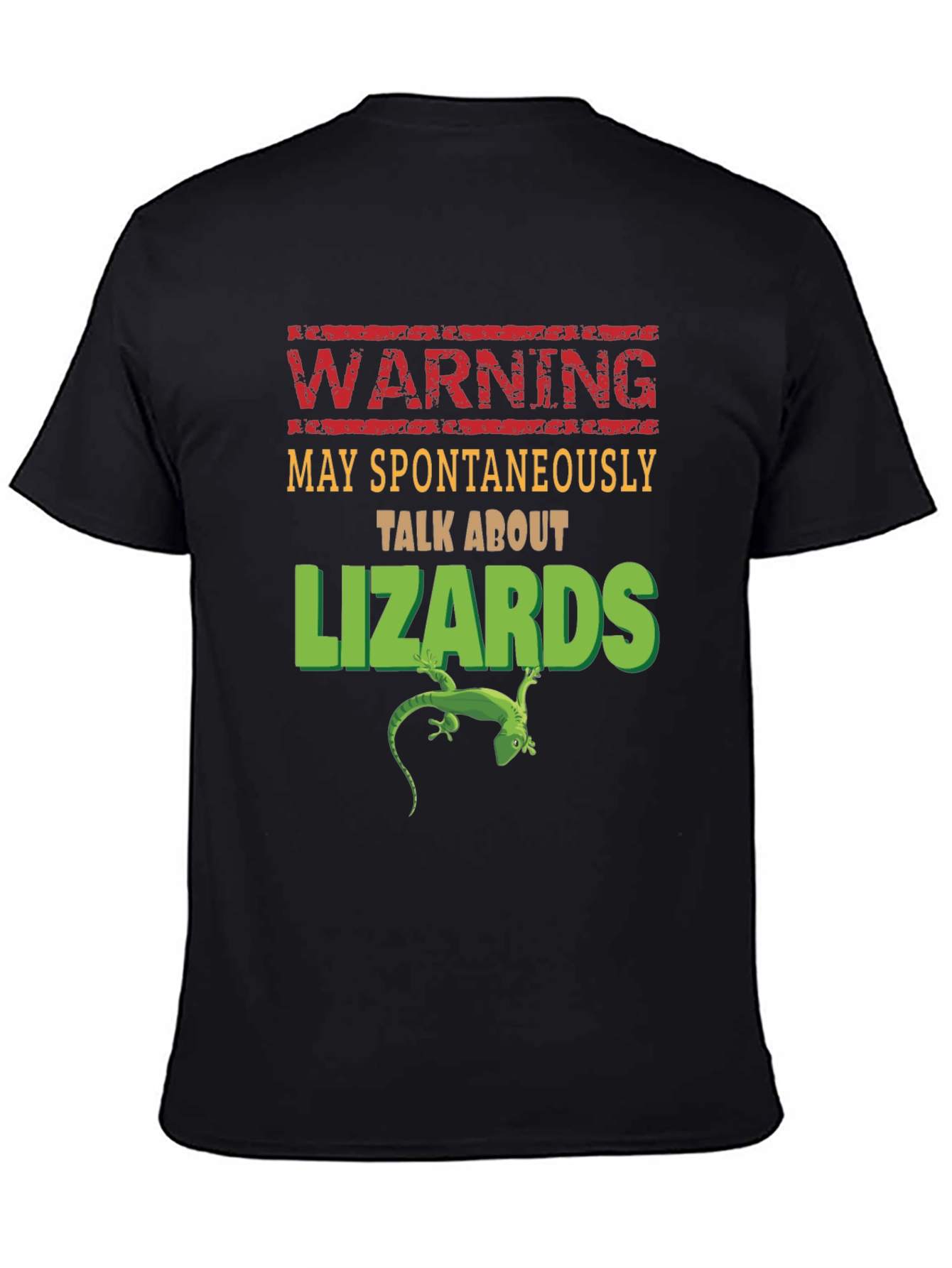 Esta camiseta negra presenta un diseño divertido y llamativo para los amantes de los lagartos. La frase "WARNING MAY SPONTANEOUSLY TALK ABOUT LIZARDS" (Advertencia: Puede hablar espontáneamente sobre lagartos) está impresa en colores rojo, amarillo y verde vibrantes, junto con una ilustración de un lagarto. Hecha de un material suave y cómodo, esta camiseta es ideal para uso casual, para expresar tu pasión por los reptiles o como un regalo original. Perfecta para cualquier ocasión informal, esta camiseta seguramente llamará la atención y generará conversación. ¡Muestra tu amor por los lagartos con estilo!