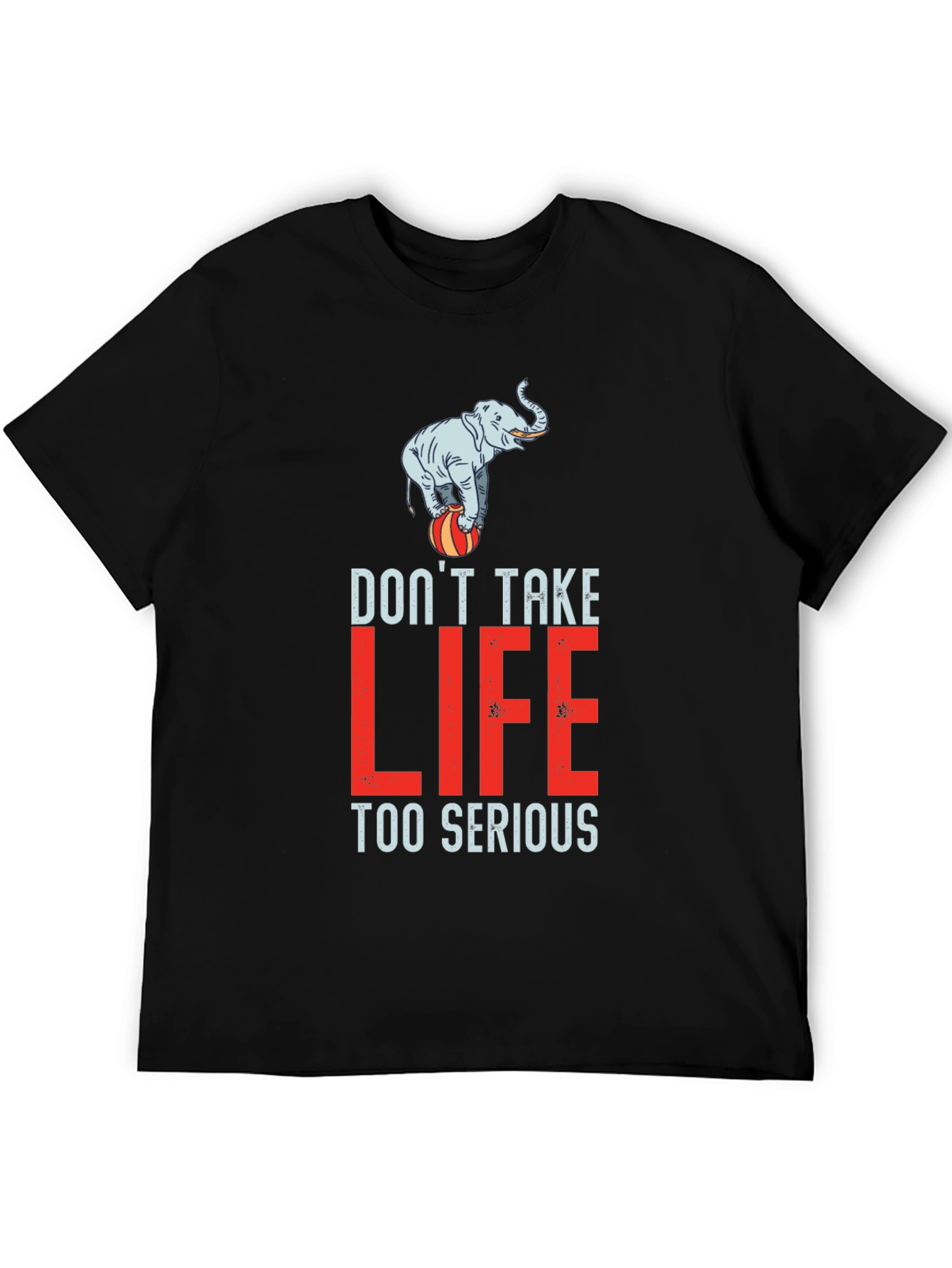 Luce esta original camiseta negra de manga corta con un diseño llamativo y divertido. Presenta un elefante en equilibrio sobre una pelota, acompañado de la frase "Don't Take LIFE Too Serious", añadiendo un toque de humor y positividad a tu vestuario. Perfecta para el uso diario, esta camiseta de corte clásico es ideal para expresar tu personalidad relajada y disfrutar de la vida con una sonrisa. Su diseño único la convierte en una excelente opción para regalar a amigos y familiares con un gran sentido del humor. ¡Atrévete a destacar con esta prenda única!