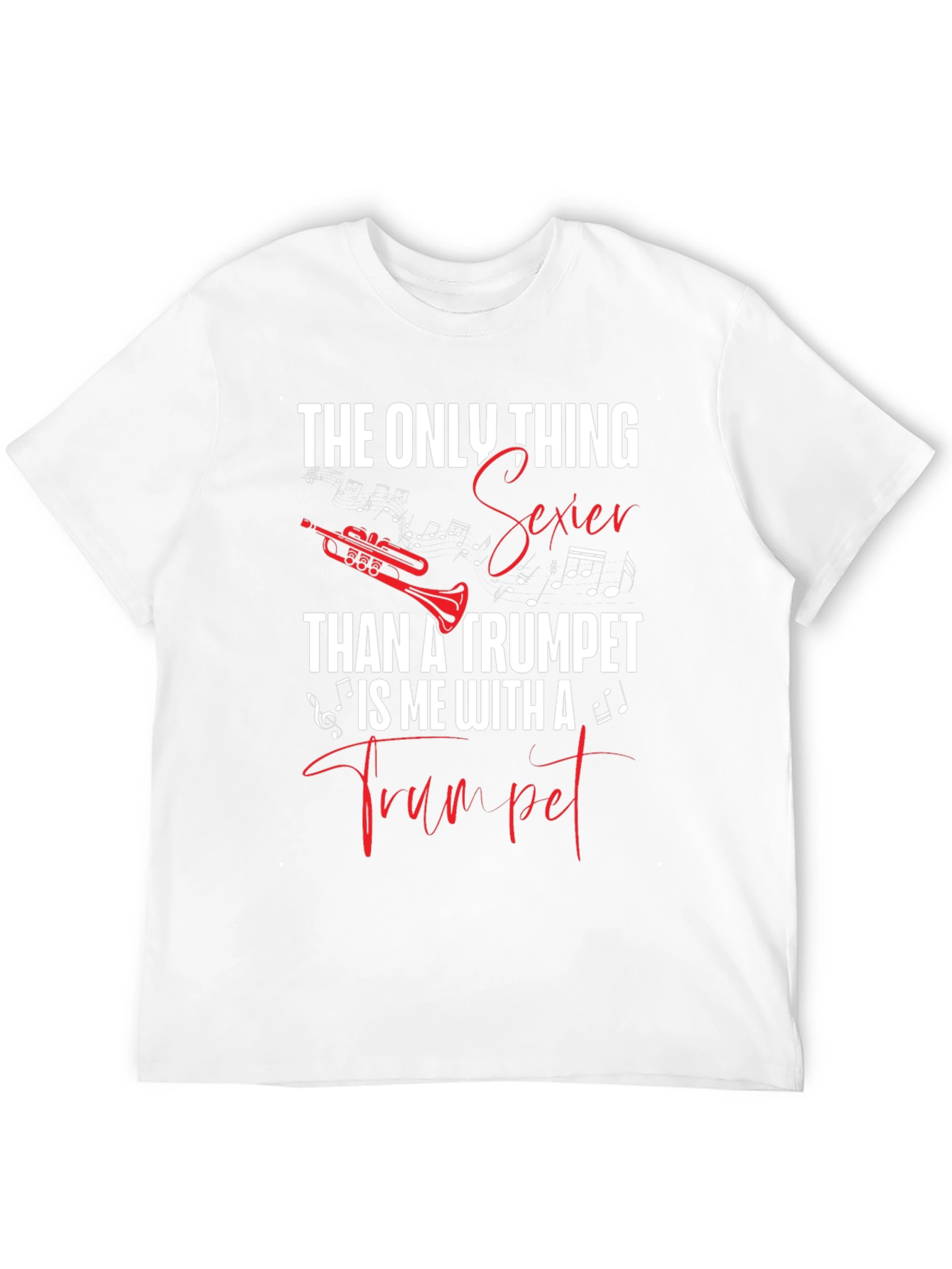 Luce esta camiseta negra de manga corta con un diseño llamativo que celebra la música y el atractivo personal. La frase "The only thing sexier than a trumpet is me with a trumpet" (Lo único más sexy que una trompeta soy yo con una trompeta) resalta en letras blancas y rojas, acompañada de una ilustración de una trompeta y notas musicales. Perfecta para músicos, amantes de la música y aquellos con un sentido del humor audaz. Ideal para uso casual, conciertos o como regalo original. Destaca tu pasión por la música con estilo y confianza.