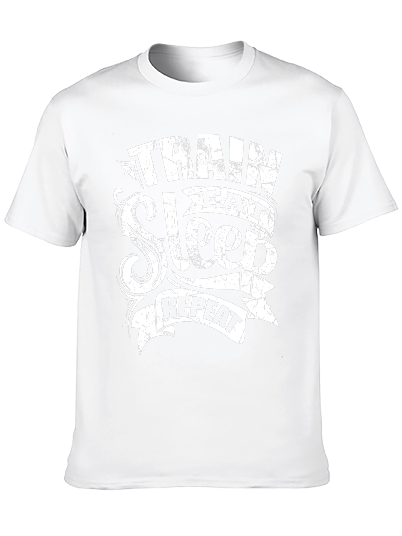 Esta camiseta negra para hombre presenta un diseño audaz y motivador con la frase "Train Eat Sleep Repeat" (Entrena Come Duerme Repite) en letras blancas desgastadas, aportando un toque urbano y deportivo. Ideal para los amantes del fitness y el estilo de vida activo, esta camiseta es perfecta para entrenar, salir a correr o simplemente lucir un look casual con actitud. Su tejido suave y ligero garantiza comodidad durante todo el día, mientras que su corte clásico se adapta a cualquier tipo de cuerpo. Hazte con esta prenda esencial para tu armario y lleva tu motivación siempre contigo.