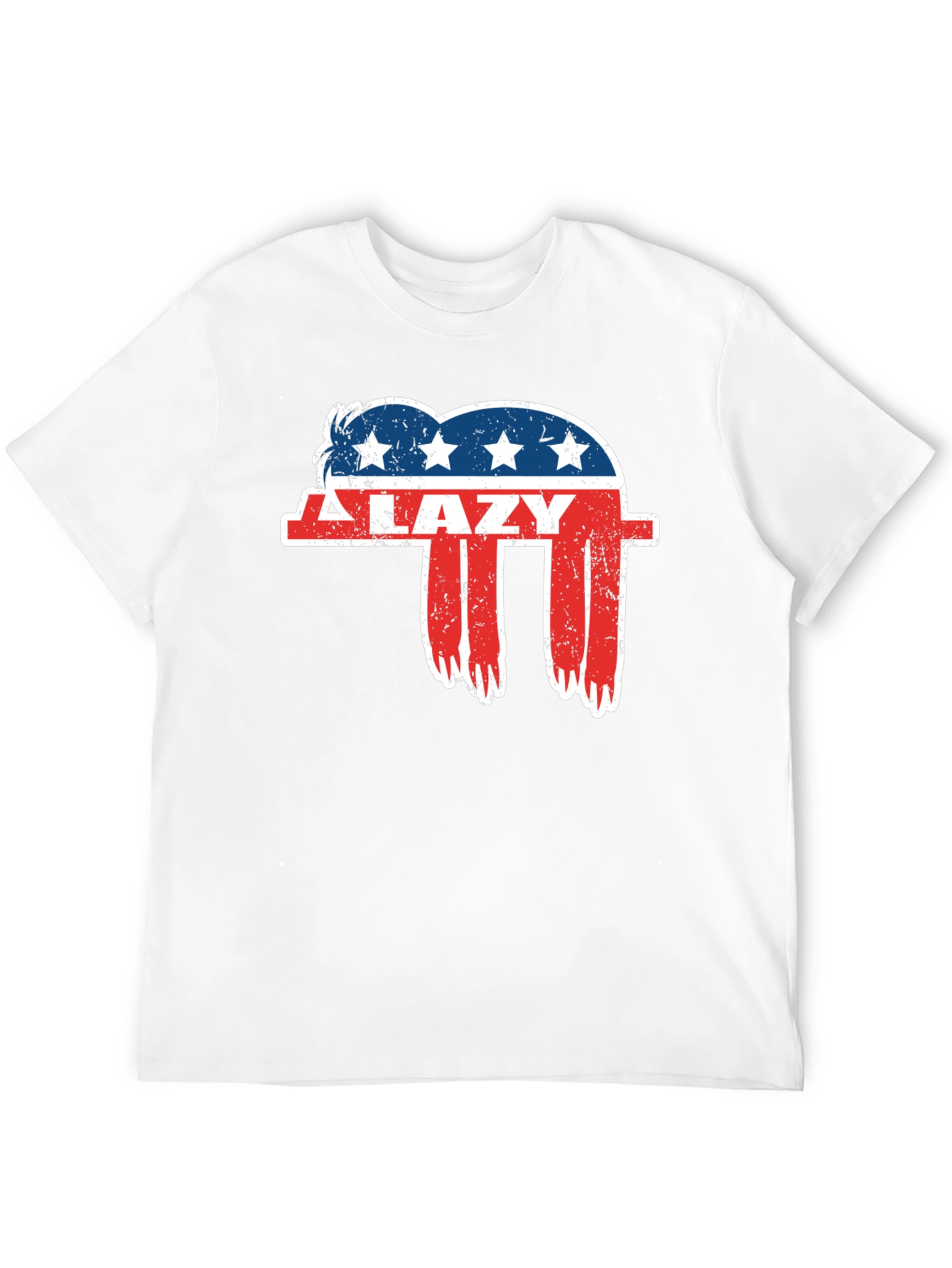 Luce esta llamativa camiseta negra de manga corta con un diseño único. Presenta una ilustración estilo vintage con colores patrióticos: azul, blanco y rojo, simulando un elefante con la palabra "LAZY" (perezoso). La combinación de estos elementos crea un estilo distintivo. Ideal para expresar tu sentido del humor y tu patriotismo de una forma original. Perfecta para usar en reuniones informales, eventos al aire libre o simplemente para relajarte con estilo. Fabricada con materiales cómodos y duraderos, esta camiseta te brindará un ajuste cómodo y un estilo que destacará.