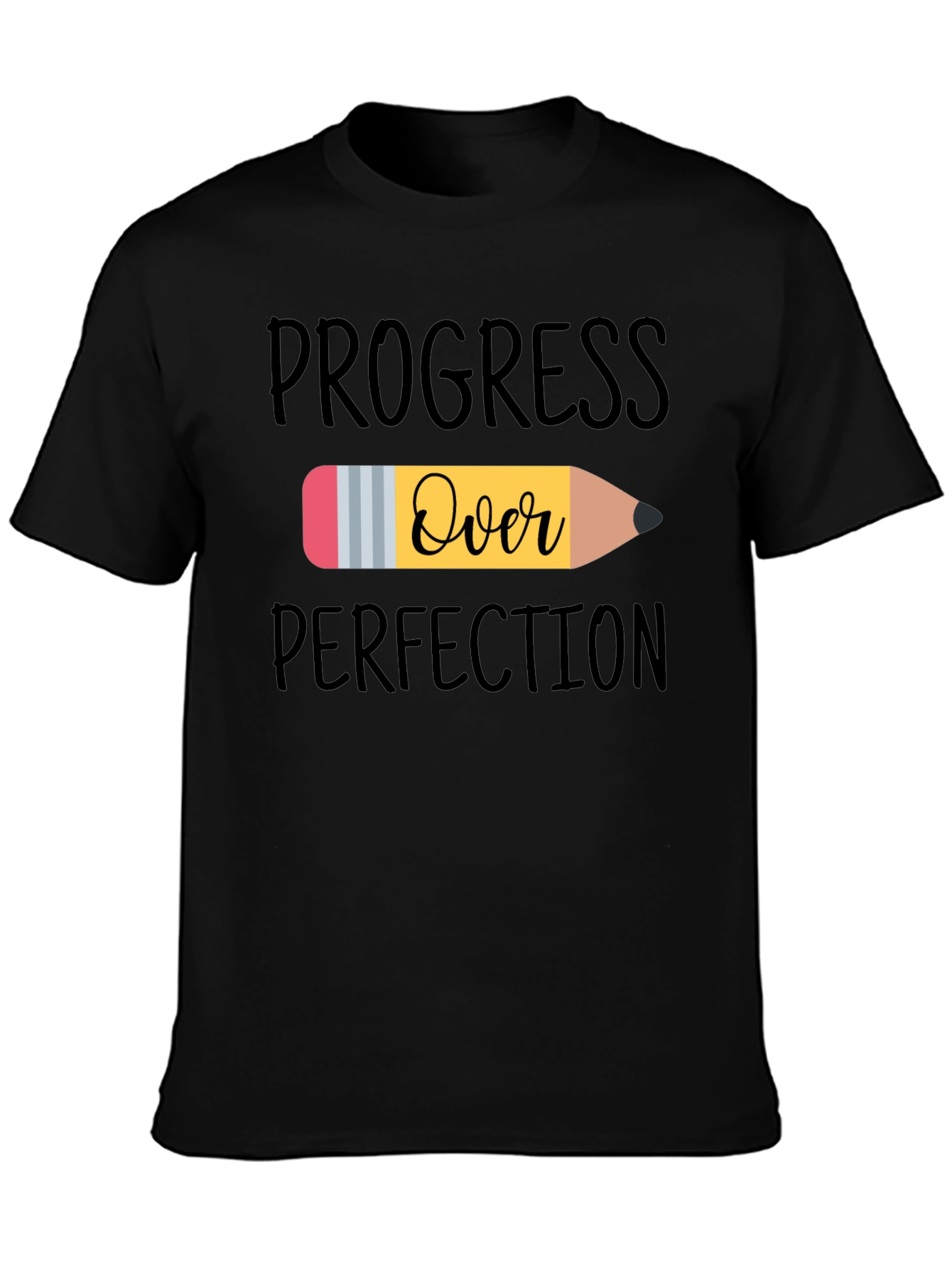 Esta camiseta negra de manga corta presenta un diseño motivacional con las palabras "Progreso Sobre Perfección". La frase está inteligentemente ilustrada con un lápiz de colores que reemplaza la palabra "Sobre". El diseño simple y elegante hace que esta camiseta sea perfecta para el uso diario, ya sea para el trabajo, la escuela o el tiempo libre. Su mensaje inspirador fomenta la mejora continua en lugar de la búsqueda de la perfección inalcanzable. El corte clásico y el color neutro la hacen versátil para combinar con cualquier atuendo. ¡Una prenda ideal para recordarte que cada pequeño paso cuenta!