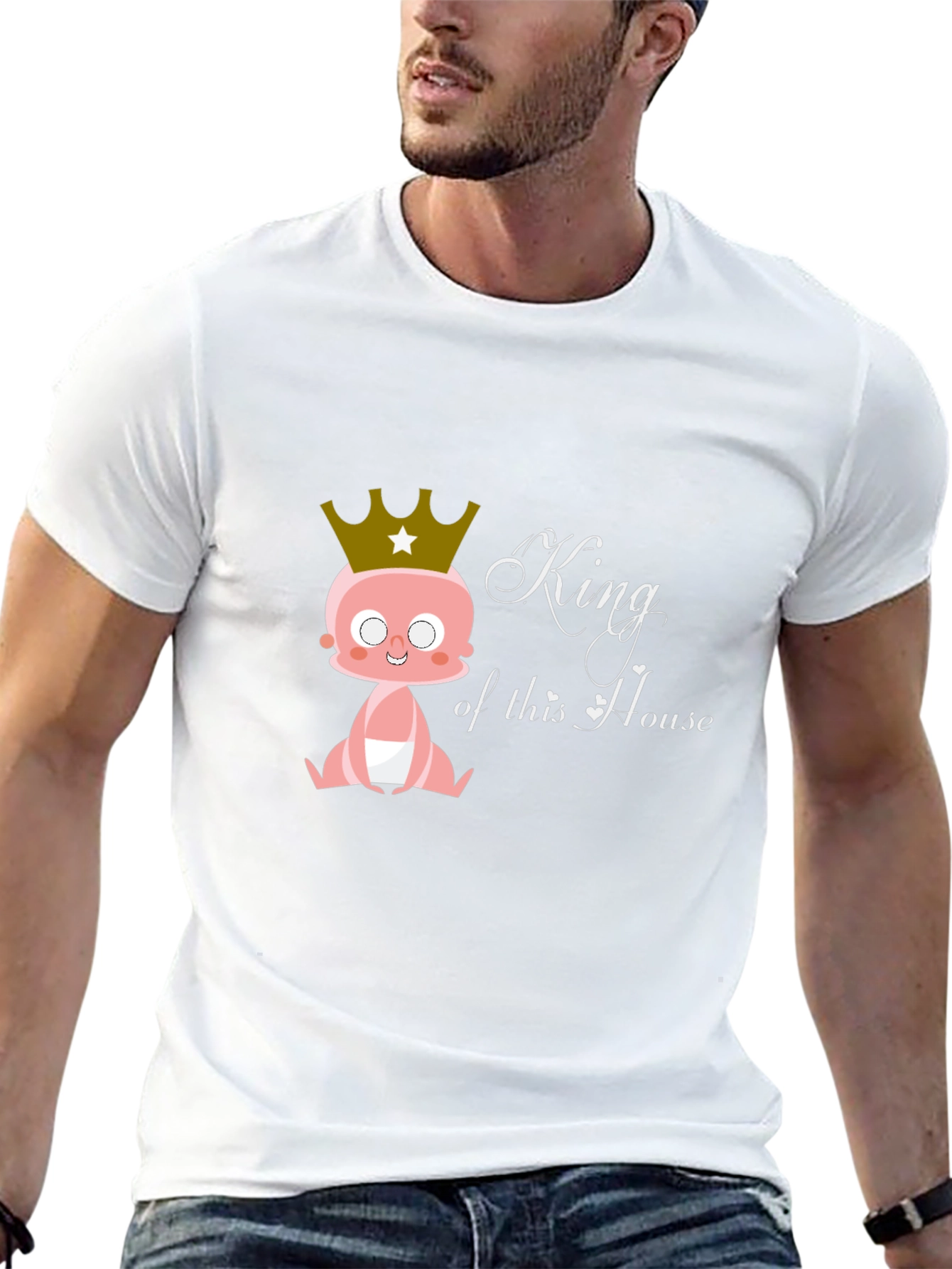Esta elegante camiseta negra presenta un divertido diseño de un bebé con una corona dorada, acompañado del texto 'King of this House' en una tipografía elegante. Perfecta para padres orgullosos, esta camiseta es ideal para usar en reuniones familiares, salidas informales o simplemente para lucir un estilo único y divertido. Confeccionada con materiales cómodos y duraderos, esta camiseta promete ser una adición favorita a tu guardarropa. Muestra tu sentido del humor y celebra al rey de tu hogar con esta original prenda.