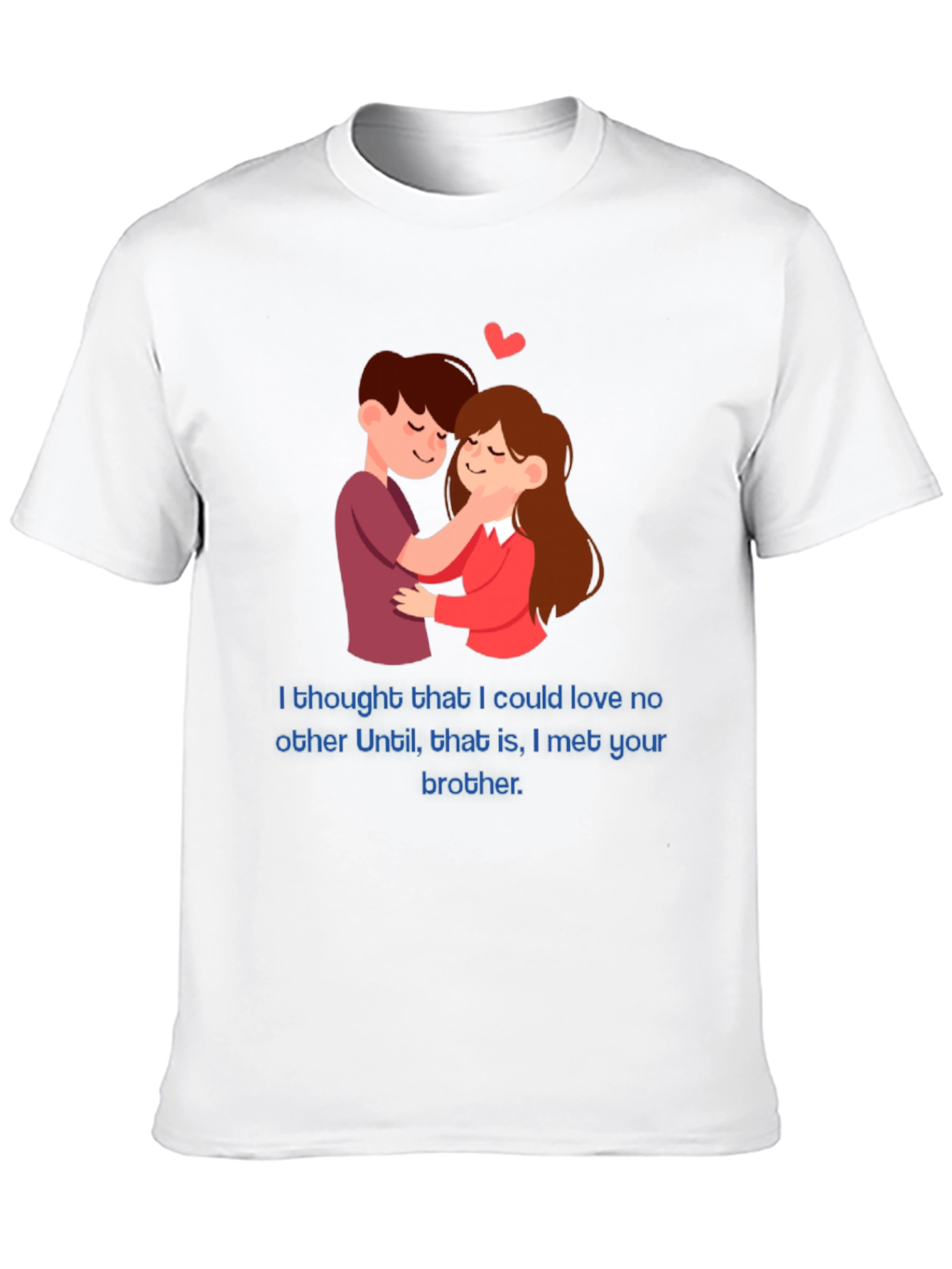 Luce esta divertida camiseta negra con un diseño romántico y un toque de humor. La camiseta presenta una ilustración de una pareja abrazada, complementada con un pequeño corazón rojo, y la frase 'I thought that I could love no other Until, that is, I met your brother' impresa en un color azul llamativo. Ideal para aquellos que aman la moda con un toque de ironía y originalidad. Perfecta para usar en salidas casuales, reuniones con amigos o simplemente para expresar tu sentido del humor único. Esta camiseta de corte clásico te ofrece comodidad y estilo en una sola prenda. ¡Atrévete a destacar con esta pieza única!