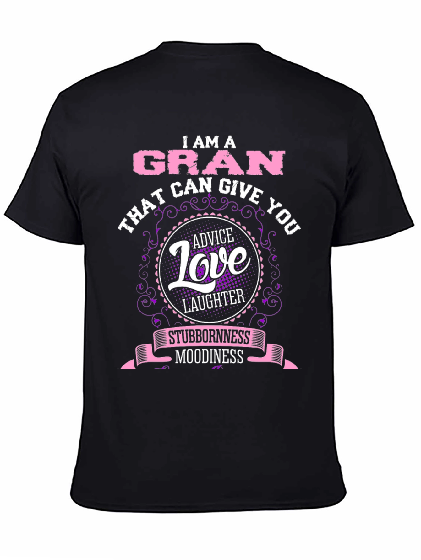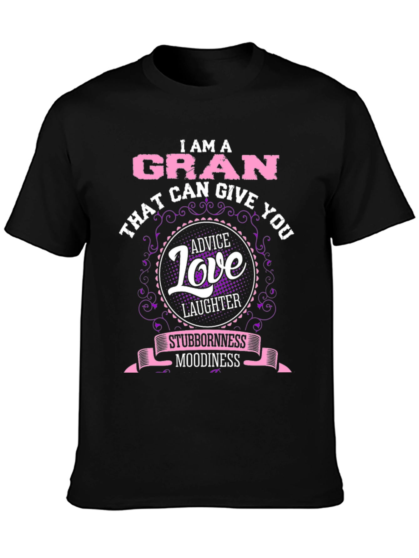 Luce con orgullo esta camiseta negra con un diseño llamativo para las abuelas con carácter. El estampado, en tonos rosas y morados, declara 'Soy una Abuela que puede darte': con un círculo central que enumera 'Consejos, Amor, Risas', seguido de 'Terquedad y Mal Humor'. Ideal para el día a día, reuniones familiares o como un regalo especial y divertido para esa abuela única en tu vida. Muestra tu lado divertido y auténtico con esta prenda cómoda y original. Un diseño perfecto para expresar tu personalidad con estilo y humor.